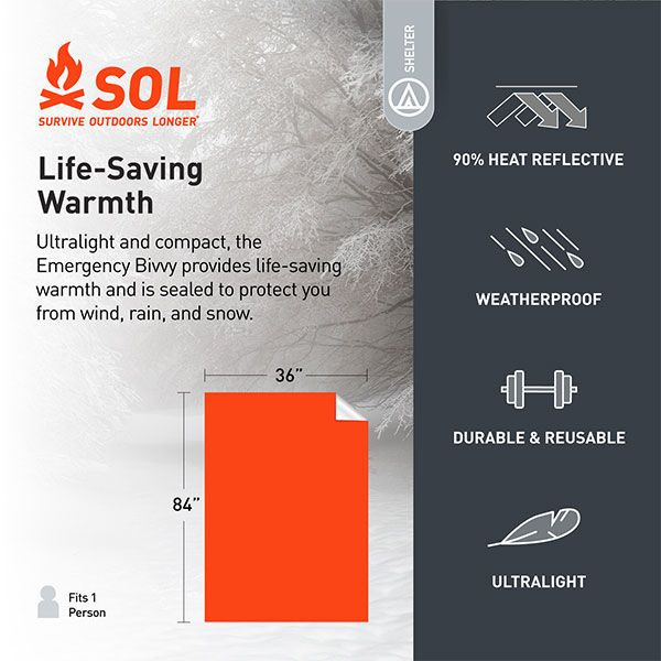 The lightweight, highly visible Emergency Bivvy XL with Rescue Whistle is large enough to shelter two people in an emergency. The waterproof, windproof material reflects 90% of body heat while sealed seams keep out rain, wind, and snow. The attached tinder cord drawstring can be used to start a fire and rescue whistle can signal for help.