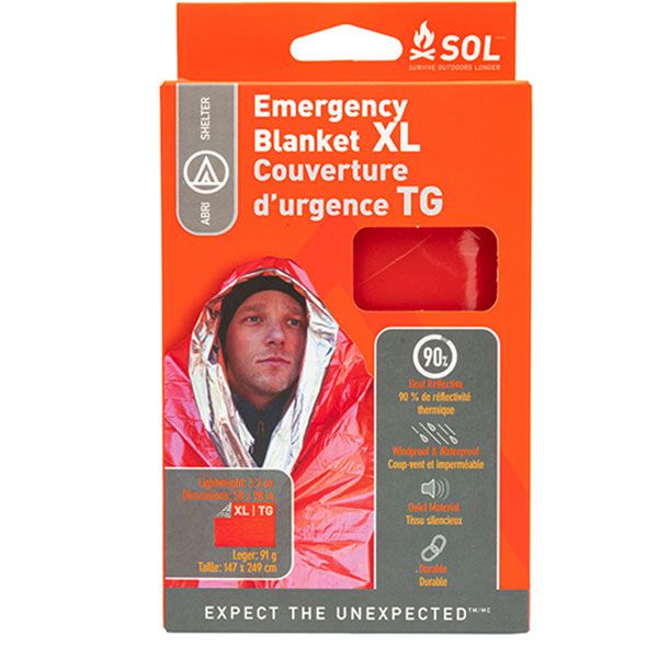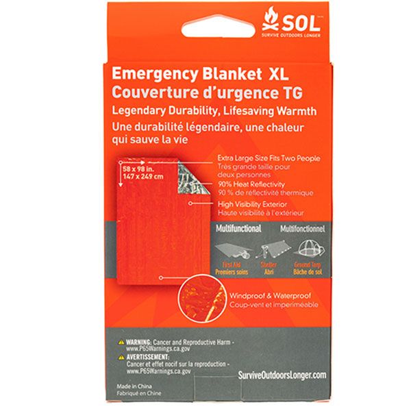 The Emergency Blanket XL features vacuum-metalized polyethylene that reflects 90% of your body heat. Blanket opens easily and will not shred if nicked or punctured, is quiet and won’t crinkle in high winds, and a high-visibility orange exterior makes it easy for rescuers to find you. Sized to fit two people.