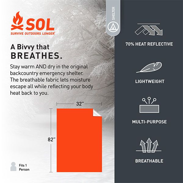 At only 5.5 oz, the Escape Lite™ Bivvy offers peace of mind and incredible versatility in a small package. Utilizing the innovative SOL Escape material, the Escape Lite is highly wind and water resistant, highly abrasion and tear resistant, heat-reflective and breathable. Use the Escape Lite™ as a performance-enhancing sleeping bag liner, an ultra-lightweight summer bag or as a fail-safe emergency bivvy.