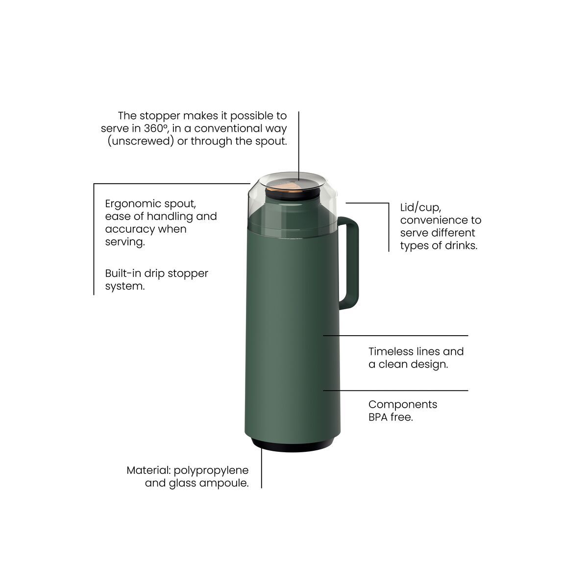 You can store your favorite beverages in it, being sure to maintain the right temperature, and carry it more easily because it is made of polypropylene with a simple design and glass liner, perfect for both hot and cold liquids