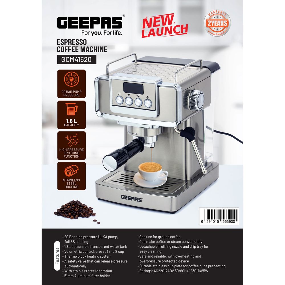 Geepas Expresso Coffee Machine With 20 Bar Pump Pressure, 1.8L Capacity, High Pressure Frothing Function, Stainless Steel Housing, Detachable Transparent Water Tank, 51 MM Aluminum Filter Holder 1.8 L 1465 W GCM41520 Silver