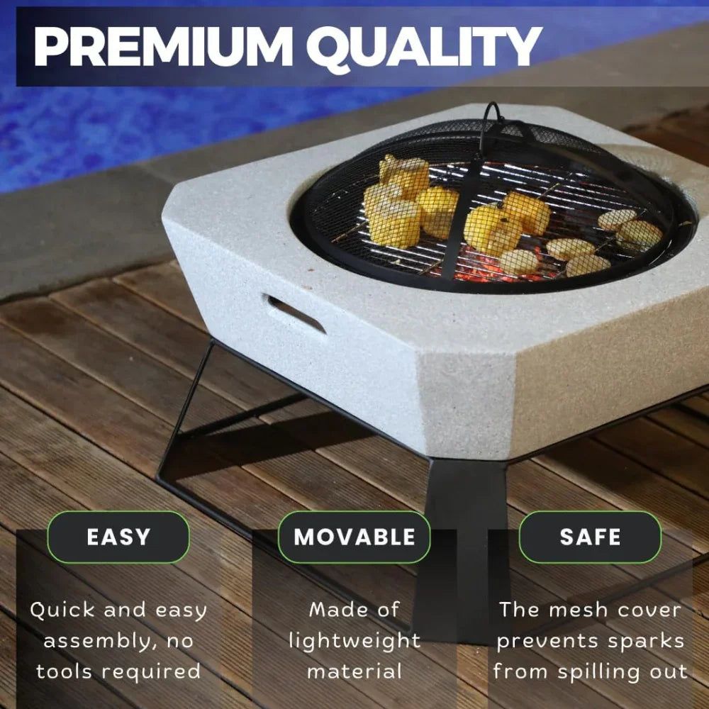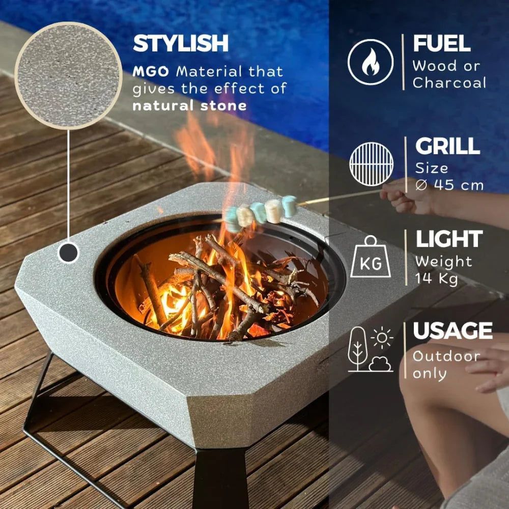 Fire Poker Square Outdoor Firepit MGO with BBQ Grill, Durable Charcoal or Wood-Burning for Backyard, Patio & Garden (Light Grey)