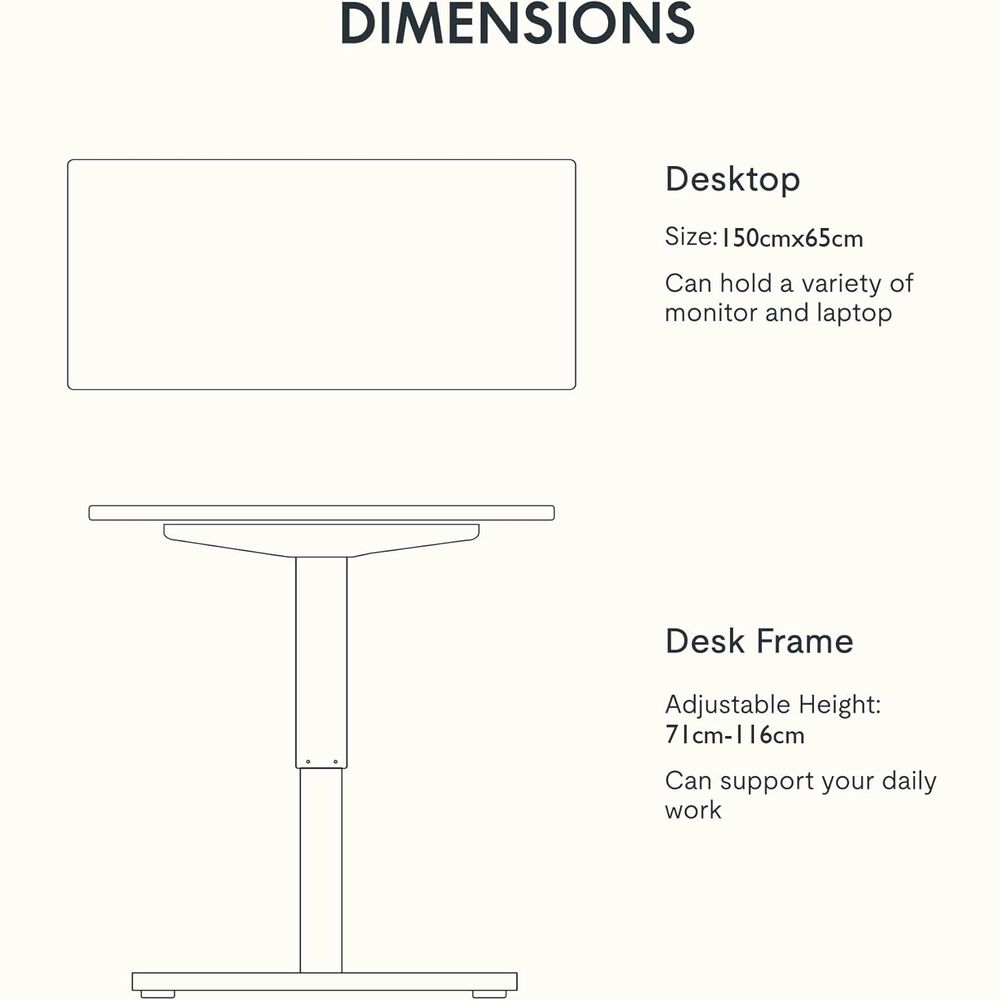 The FlexiSpot Standing Desk offers ergonomic height adjustment (71 cm to 116 cm) with a simple button press. The 150x65 cm desktop provides ample space for multiple monitors, laptops, and accessories, while the durable steel frame ensures stability. Featuring 4 programmable memory settings, you can switch positions effortlessly. The low-noise motor (below 50 dB) makes it ideal for quiet workspaces. Easy to assemble and built for long-term use, this standing desk helps improve posture, reduce strain, and create a more active and productive work environment at home or in the office.