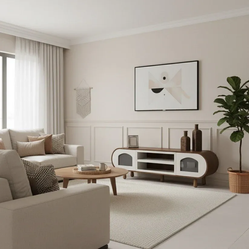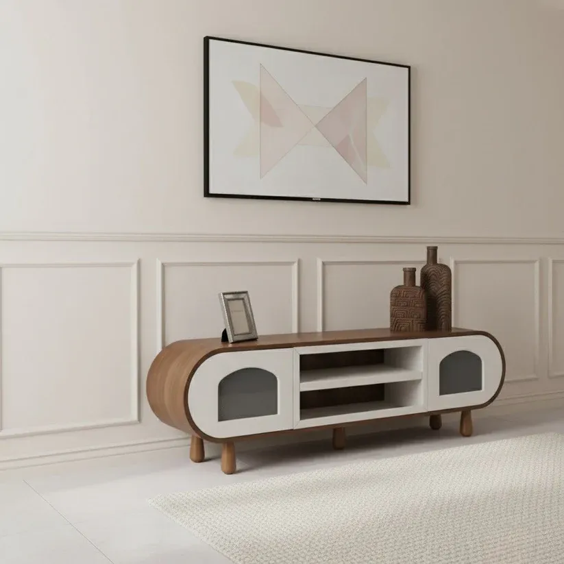 The Discovery TV Unit Cream Walnut 200cm is a perfect balance of style and practicality, designed to elevate modern living spaces. With its refined cream and walnut finish, this piece adds warmth and sophistication while blending seamlessly into contemporary and transitional interiors. Supported by sturdy solid wood legs, it offers both stability and natural charm.