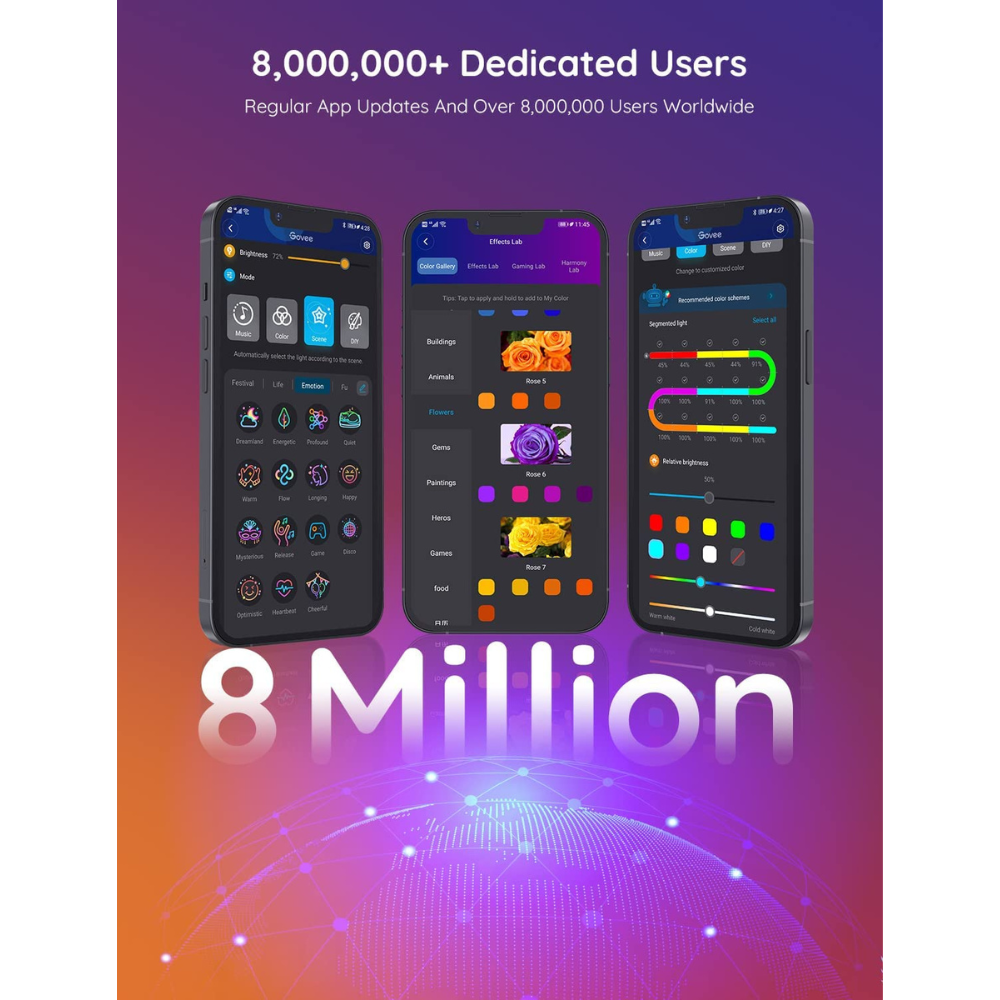 Designed for both Wi‑Fi and Bluetooth control through the Govee Home app, they offer access to over 16 million colors, 64+ preset scenes, DIY customization, timer schedules, and music-sync modes that respond to audio via a built-in high‑sensitivity microphone.