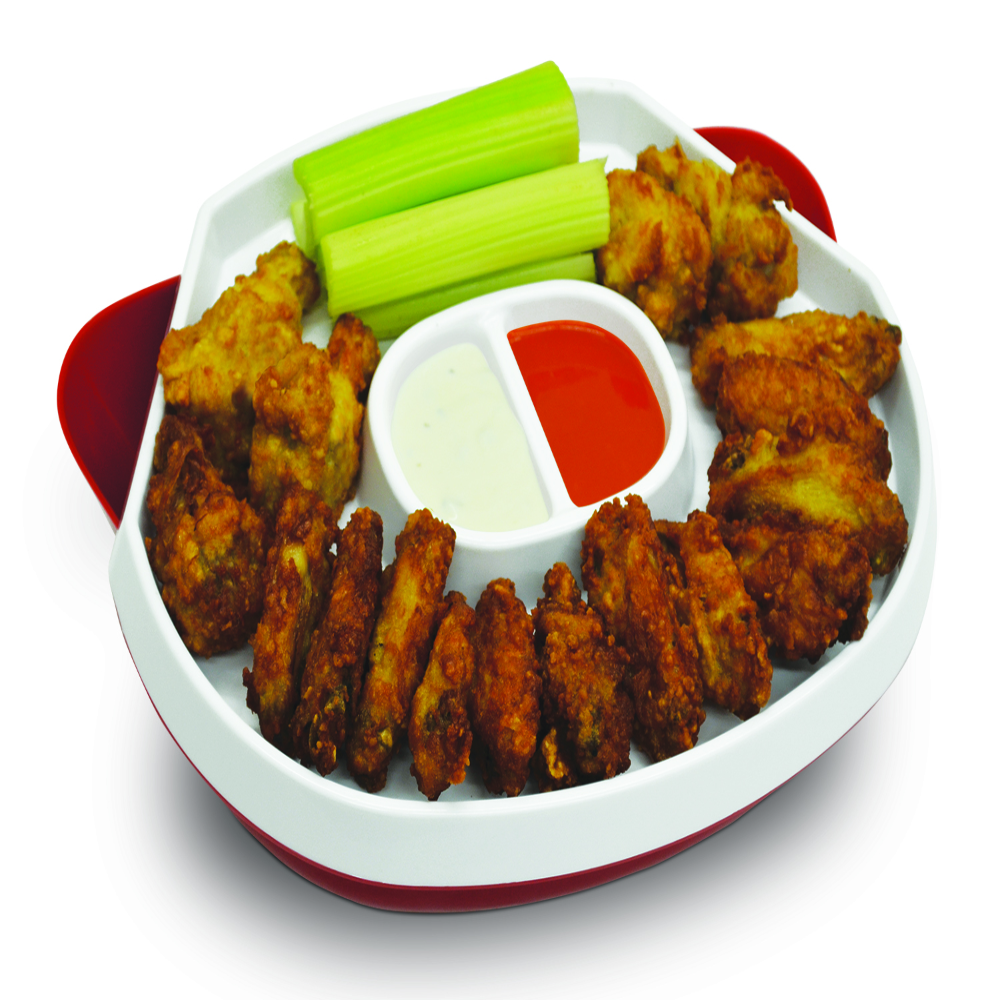 The ultimate hot wings plate with space to serve 12+ wings, veggies and 2 dips; ideal wings platter, party snack tray or serving dish.