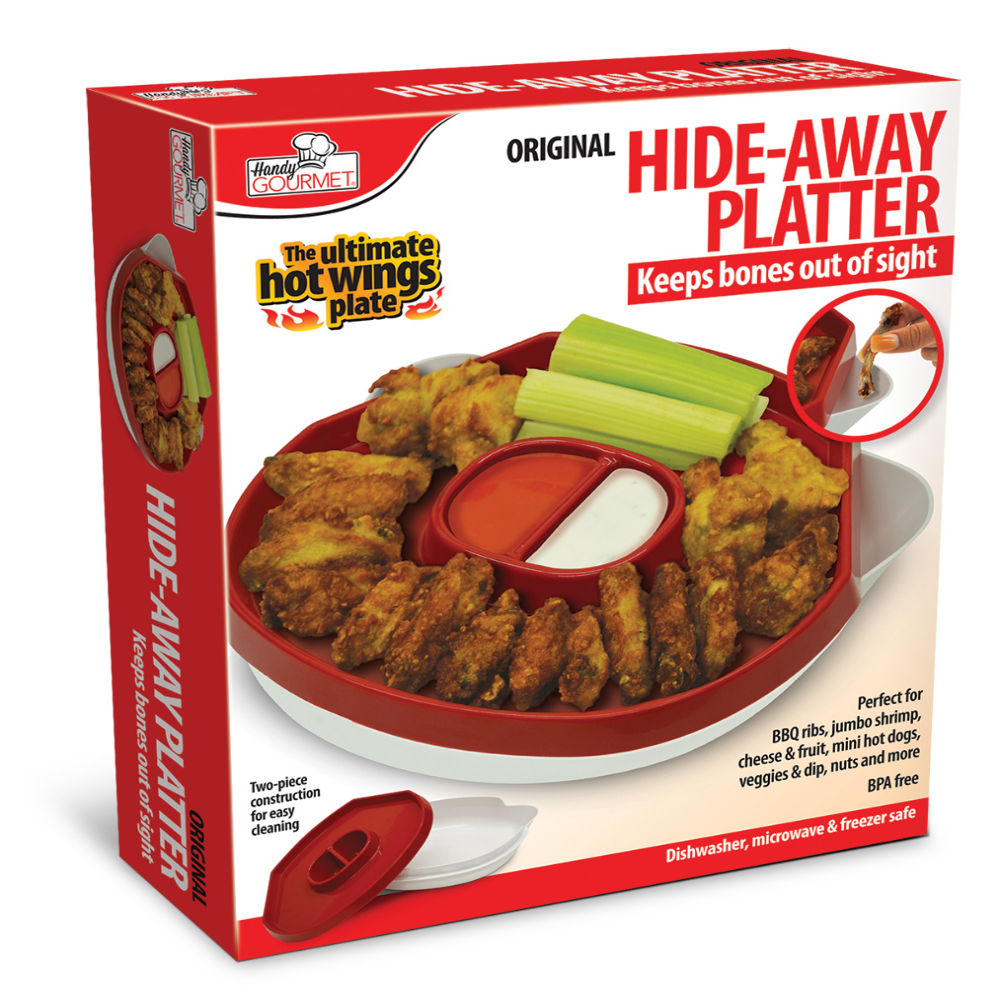 The Handy Gourmet Hide Away Platter is the ultimate serving tray designed for clean, convenient and organized snacking. This multi-purpose “Hot Wings Plate”, “Party Snack Tray”, and “Appetizer Serving Platter” features space to serve 12+ wings with room for veggies and two built-in dip compartments, making it perfect for ranch, BBQ sauce, cheese dip or ketchup. Ideal for game nights, parties, movie nights, BBQs, picnics, and family gatherings, it delivers a mess-free, enjoyable serving experience for everyone. Its smart hidden storage bowl beneath the serving tray discreetly collects chicken bones, shrimp tails, nutshells, toothpicks and food waste, keeping your dining table clean, organized and hygienic while guests enjoy their snacks. Perfect as a personal plate or as a shared party platter, it is designed for both individual use and entertaining guests. Made from high-quality BPA-free, food-safe material, the platter is microwave safe, freezer safe and dishwasher safe. Durable, reusable and ideal for everyday use, this convenient serving tray saves time, reduces mess and enhances your hosting experience.
