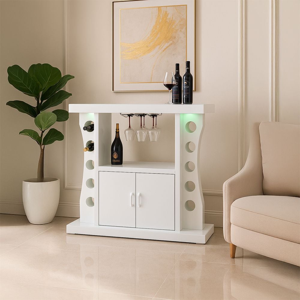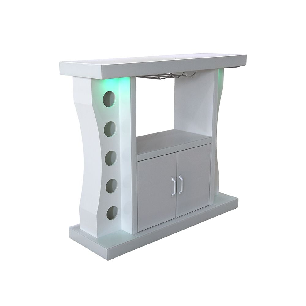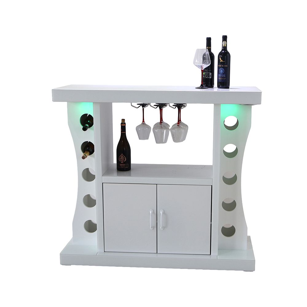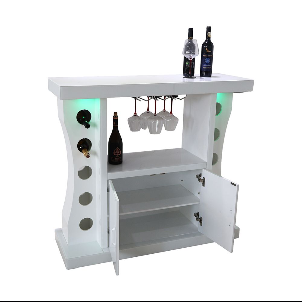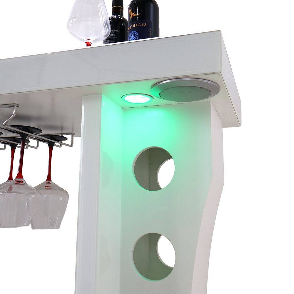 Hazky Glass Top 2 Door Bar Counter With RGB Downlight+Bluetooth Speaker+ Wine Glass Hangers and Bottle Holders - High Gloss White
