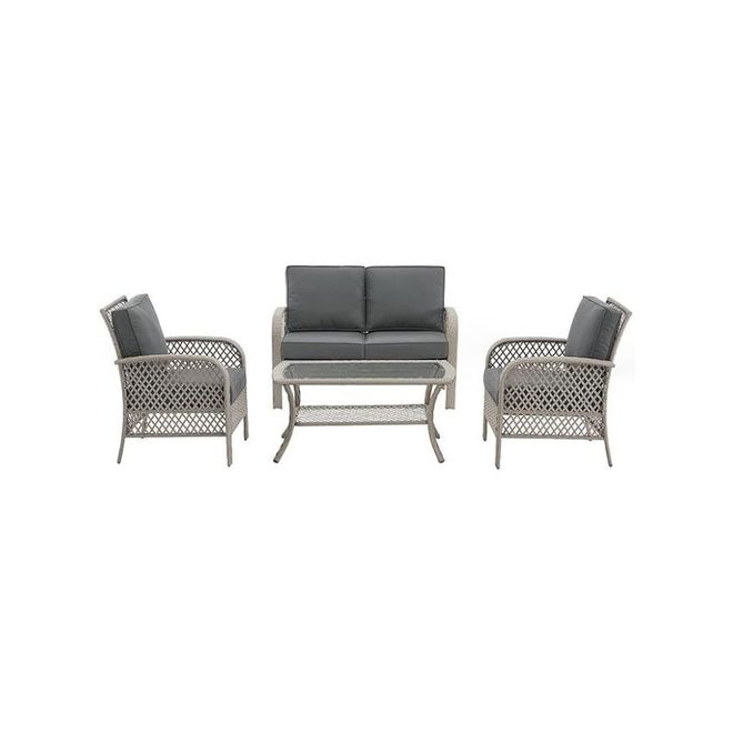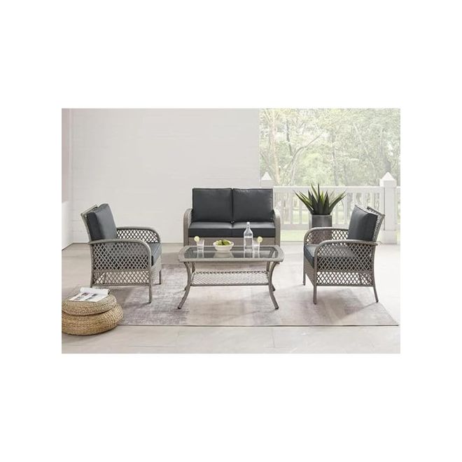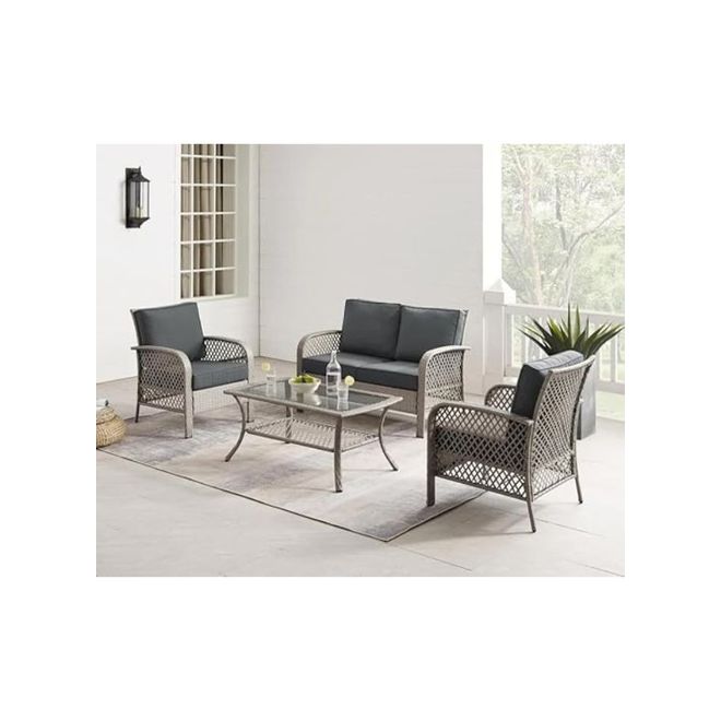 This 4-piece patio set includes two cushioned rocking chairs, a cushioned loveseat, and a tempered glass-top table, making it ideal for relaxing, socializing, or enjoying a peaceful evening outdoors.