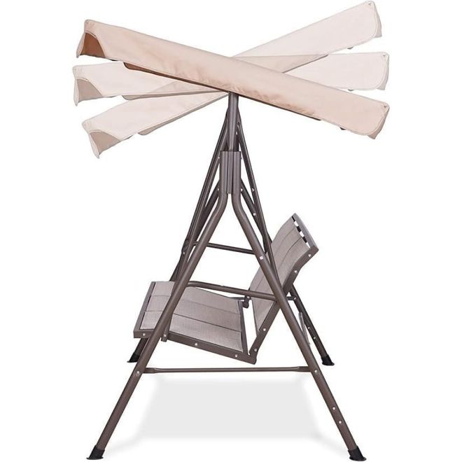 Constructed with a sturdy, adjustable steel frame, this swing chair ensures exceptional stability and long-lasting durability. The beige weather-resistant fabric provides UV protection and water resistance, ensuring that it withstands various outdoor conditions. The adjustable canopy allows you to control shade and sun exposure, making it ideal for use on patios, balconies, gardens, or even the beach.