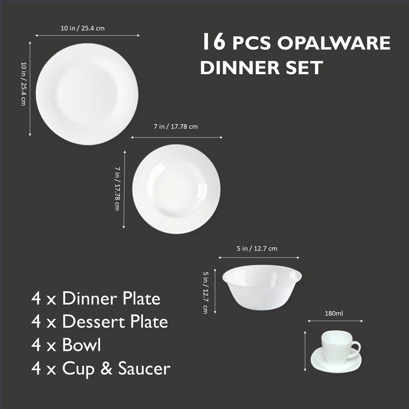Houzi 16 Pcs Opal ware Dinner set 4 x Dinner plate 4 x Dessert Plate 4 x Bowl 4 x Cup and Saucer Dishwasher Microwave safe BPA Free