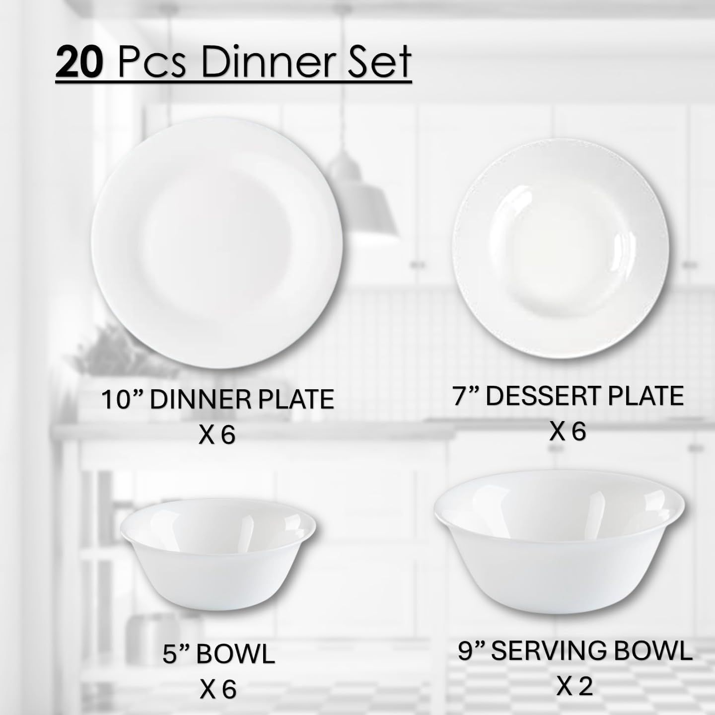 Houzi 20 Pcs Opal ware Dinner set 6 Dinner plate, 6 Dessert plate, 6 Bowls and 2 Serving bowl Dishwasher Microwave Freezer safe BPA Free Heat resistance