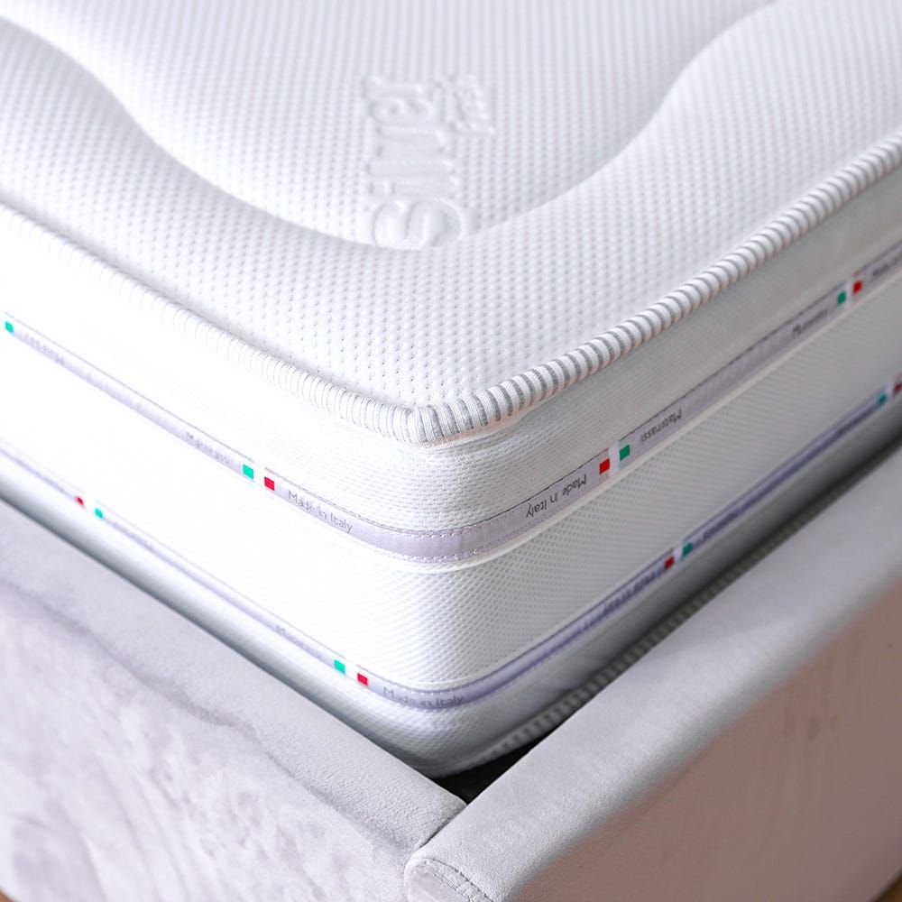 Framework: Top side in Memory Visco Foam h 4 cm D45 kg/m3, with particular benefits in balancing and relaxing the body during sleep stages. Bottom side is in deformable Expanded Polyurethane D25 kg/m3 with open cells for an optimal support., tailored to different postural needs, giving the correct elastic response