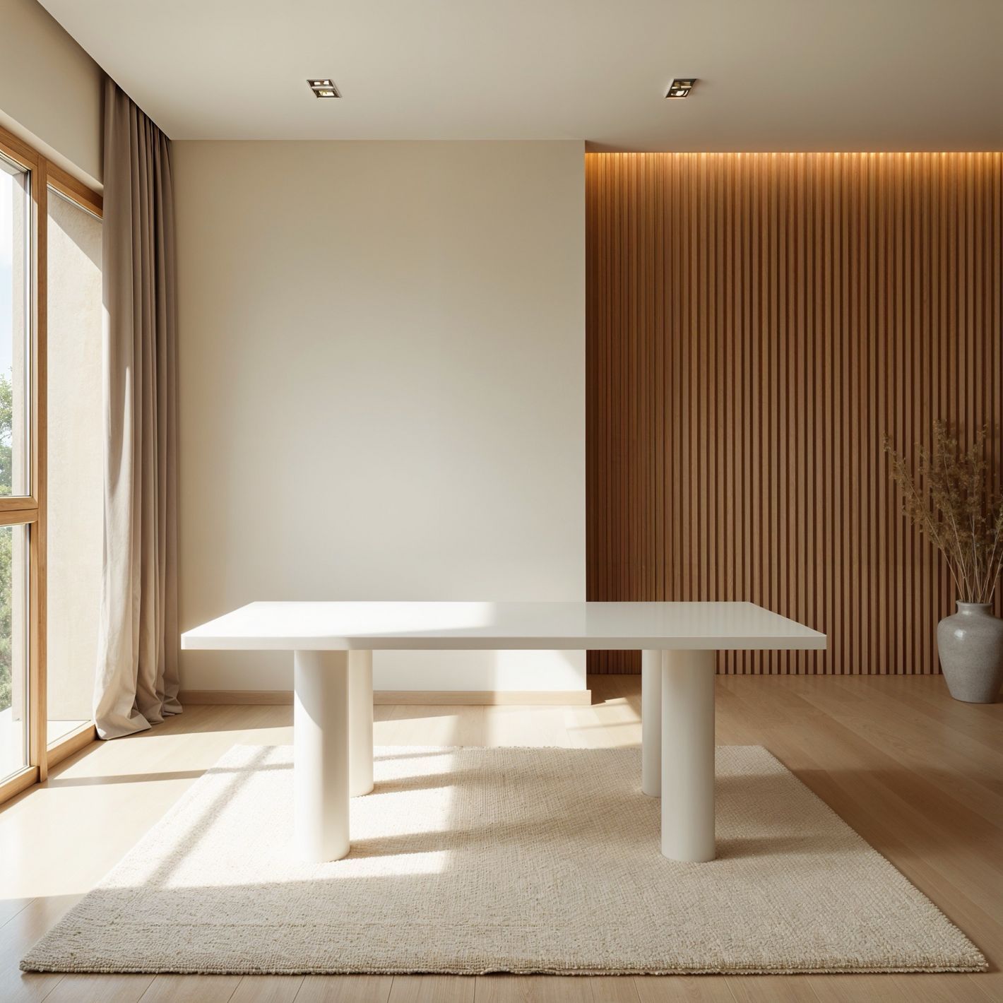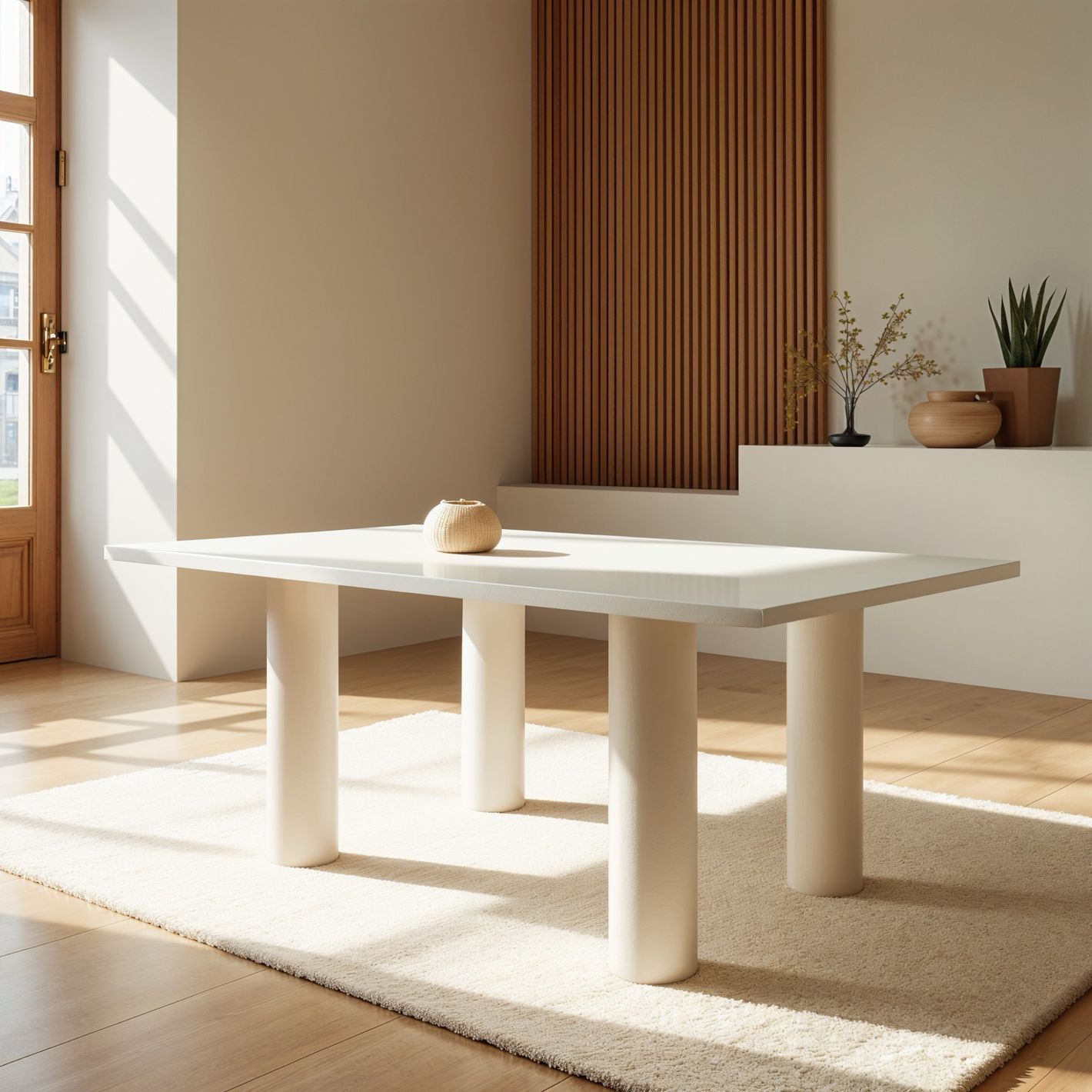 Featuring a smooth rounded tabletop supported by four sturdy cylindrical legs, this design blends stability with unique contemporary style