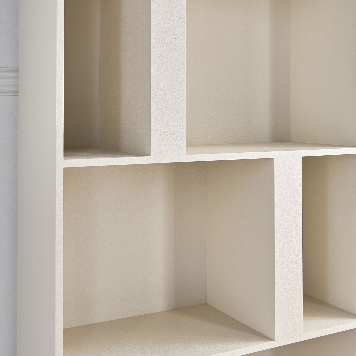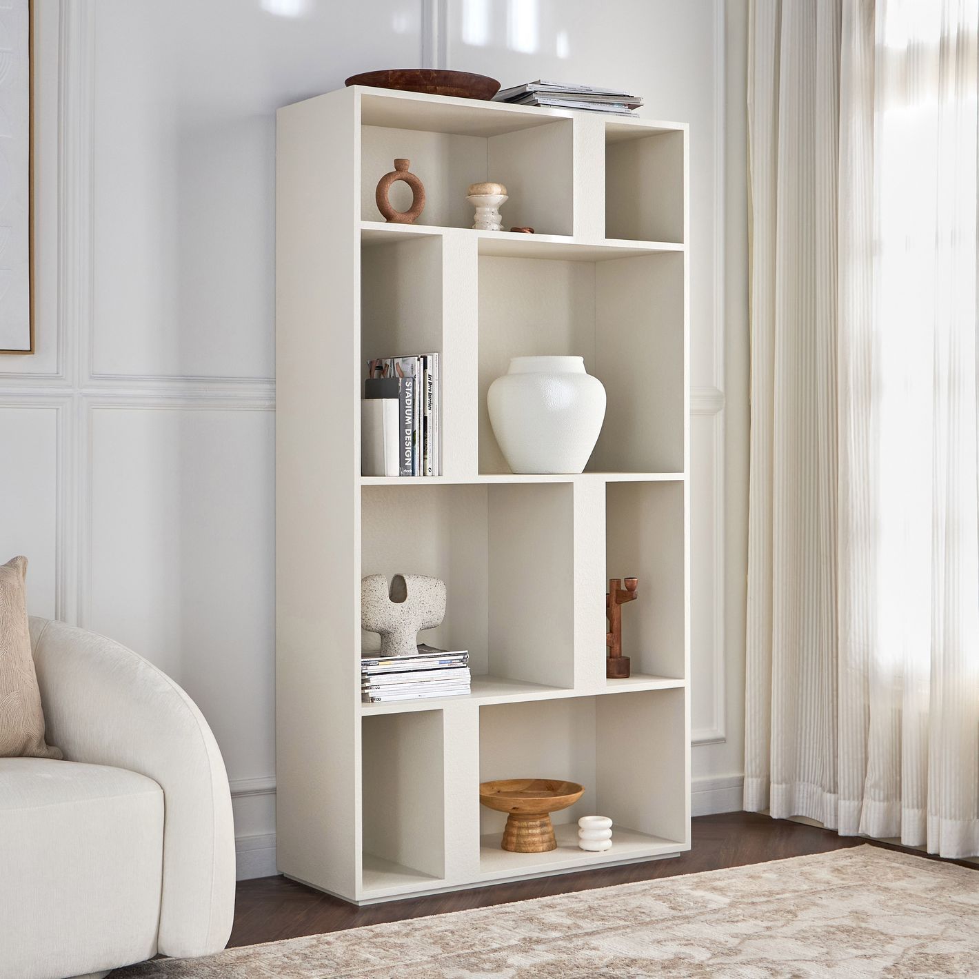 Its distinctive arrangement of compartments in varying shapes and sizes creates visual intrigue while providing versatile storage for books, décor, or daily essentials