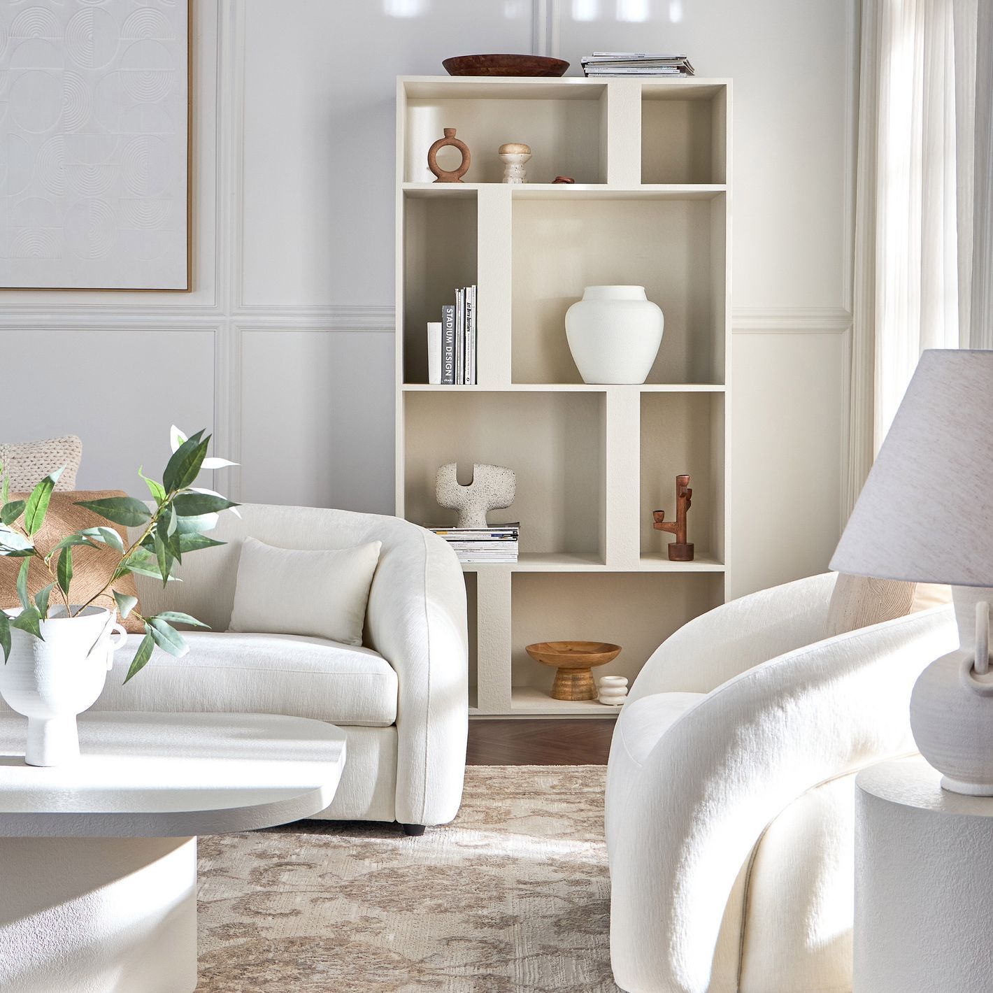 Balance Display Unit – Modern Wooden Shelf Cabinet with Unique Compartments for Living Room Décor (White)