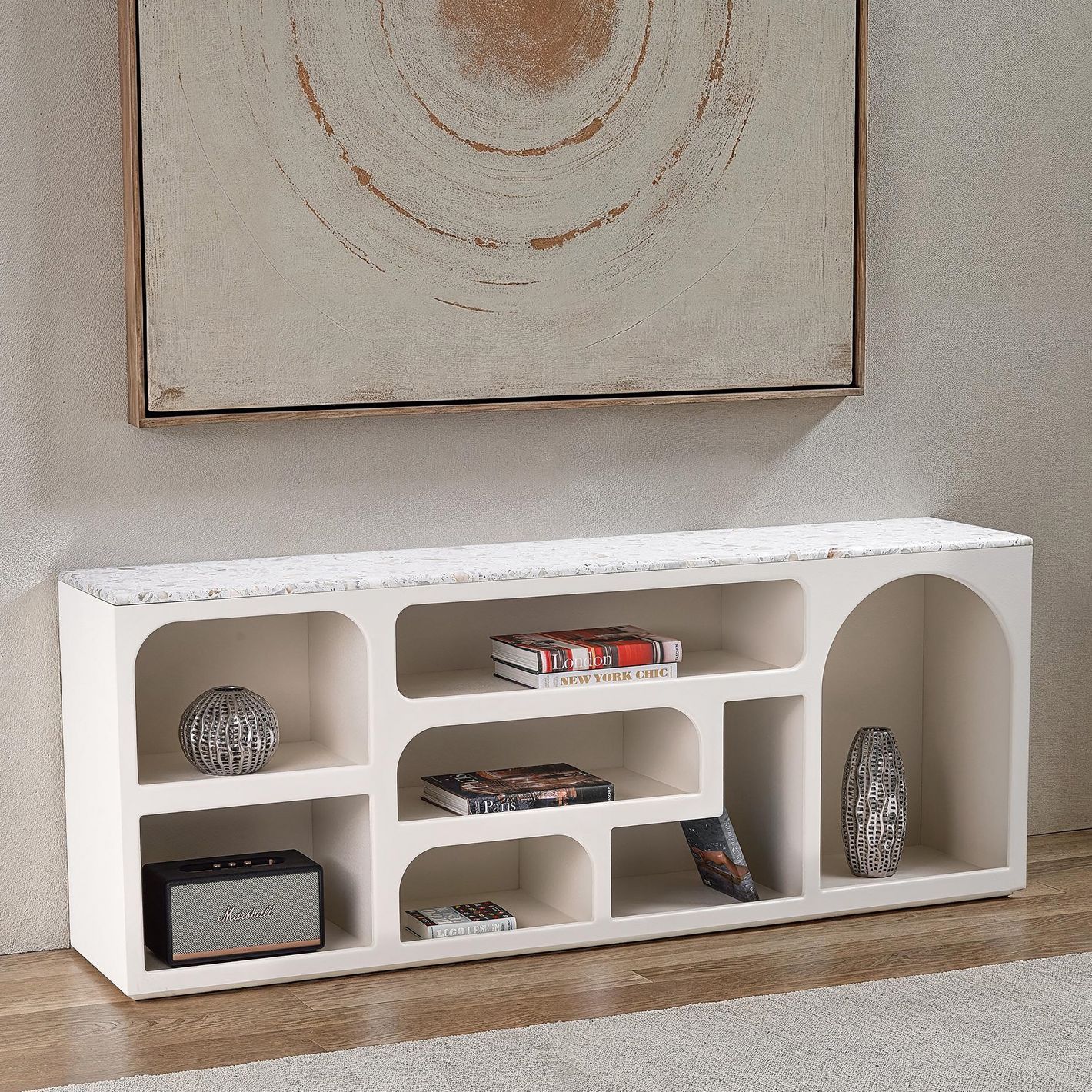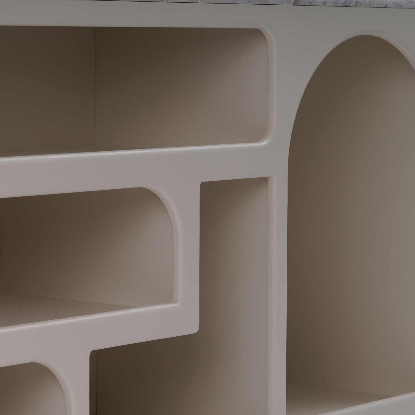 Its asymmetrical open shelving and soft arches create an expressive interplay of geometry and texture, offering versatile storage for curated décor, glassware, or dining essentials