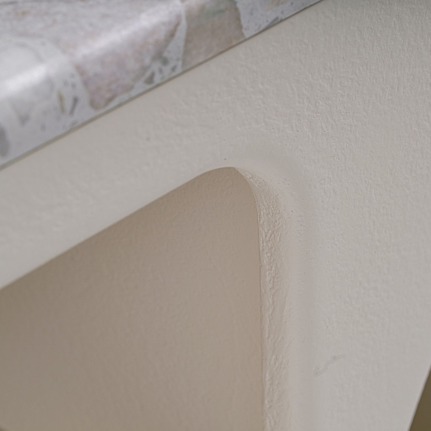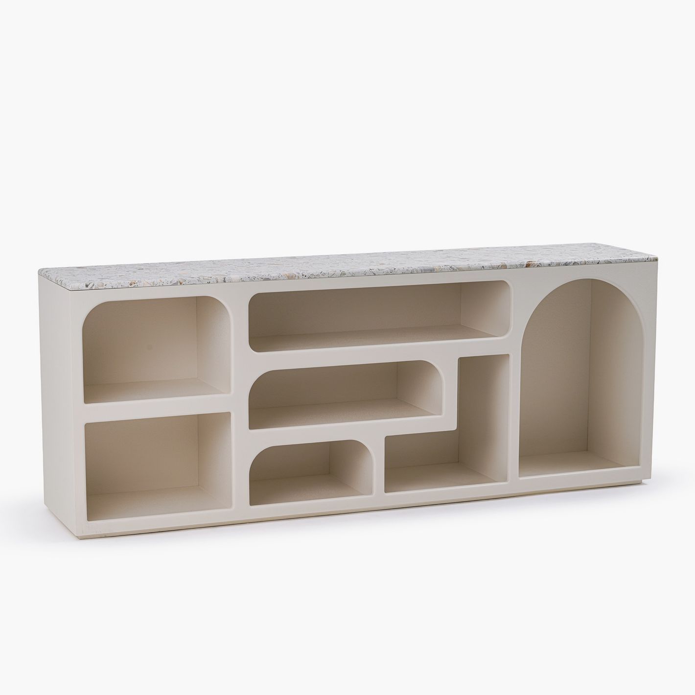 Finished in smooth plaster and crowned with a refined terrazzo top, this sideboard balances elegance with architectural character
