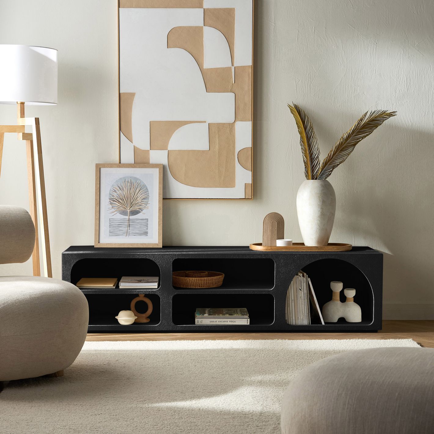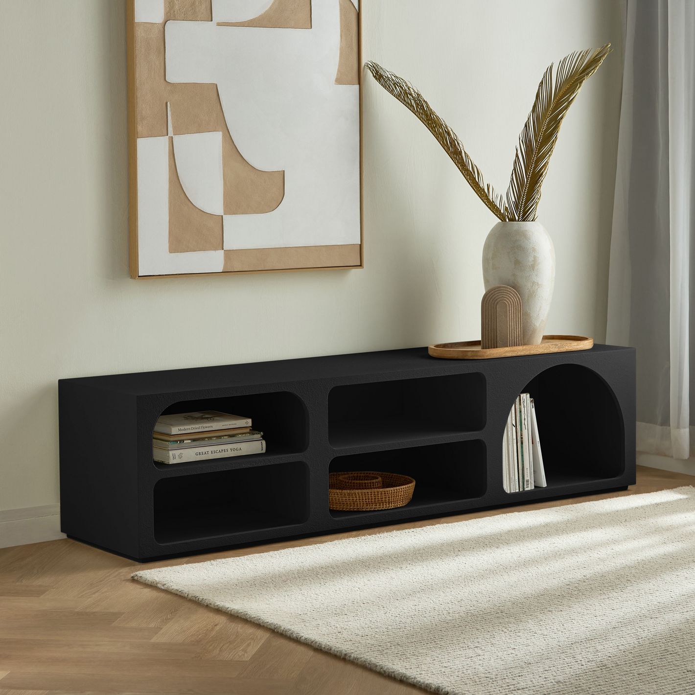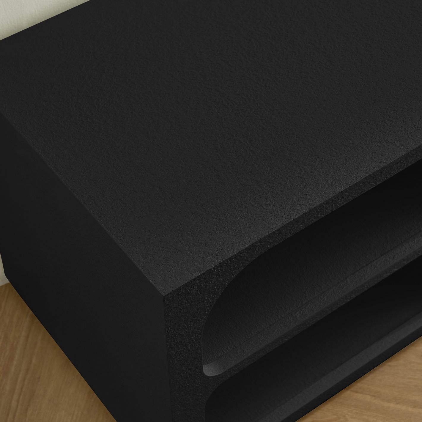 Two open shelves provide ample space for consoles, remotes, and accessories, ensuring your area stays organized and clutter-free