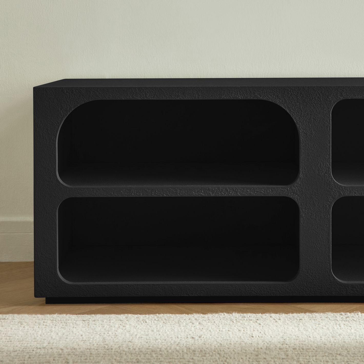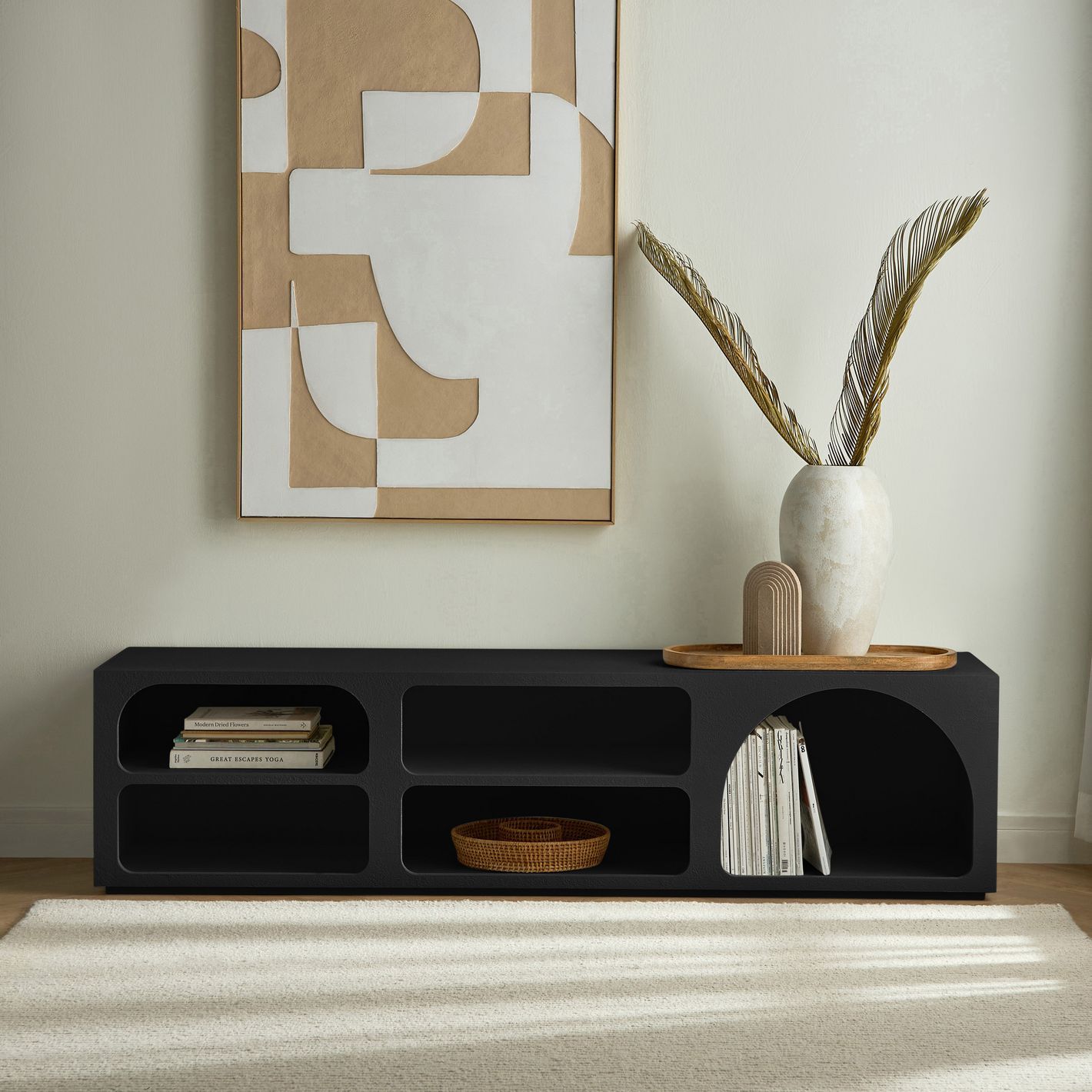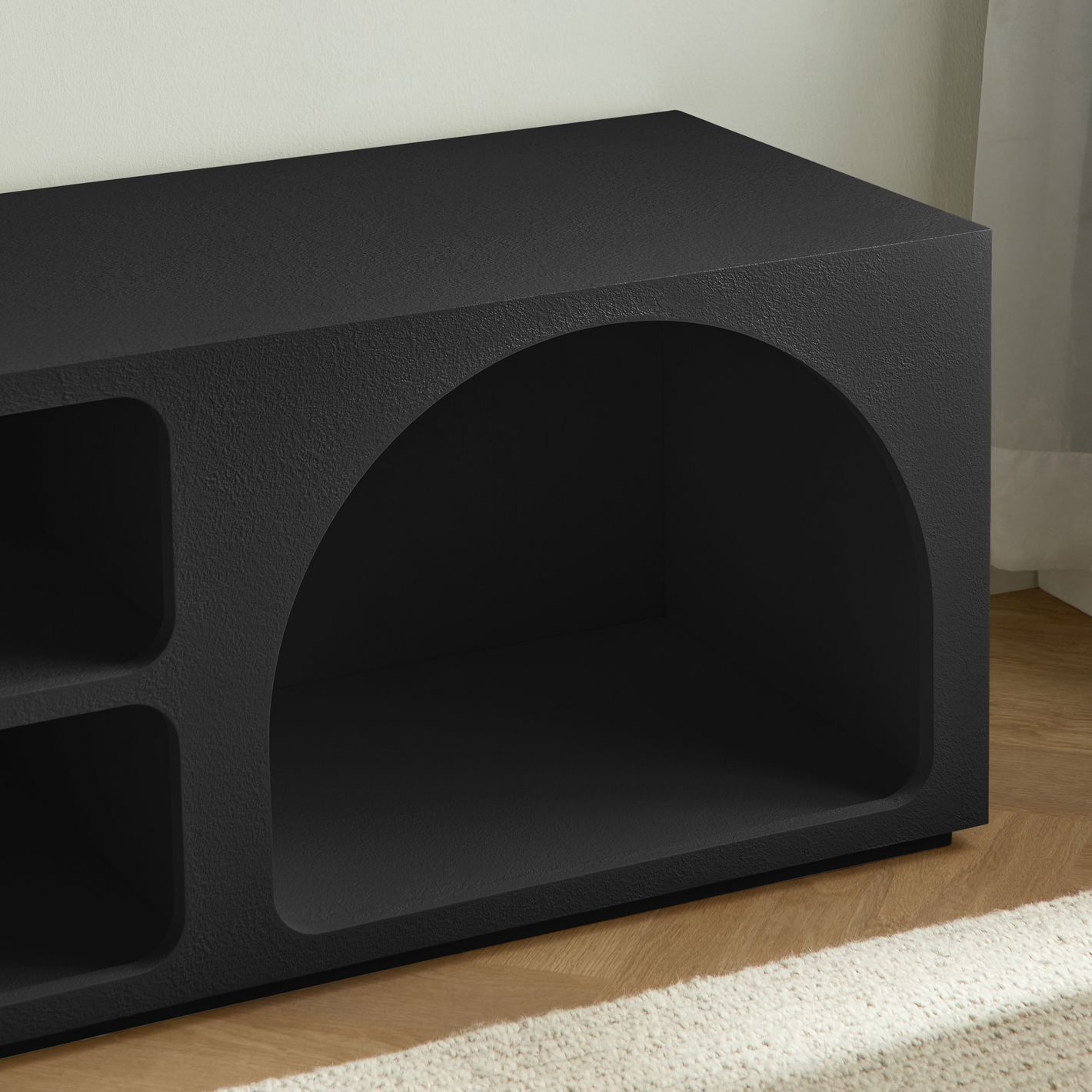 Two open shelves provide ample space for consoles, remotes, and accessories, ensuring your area stays organized and clutter-free