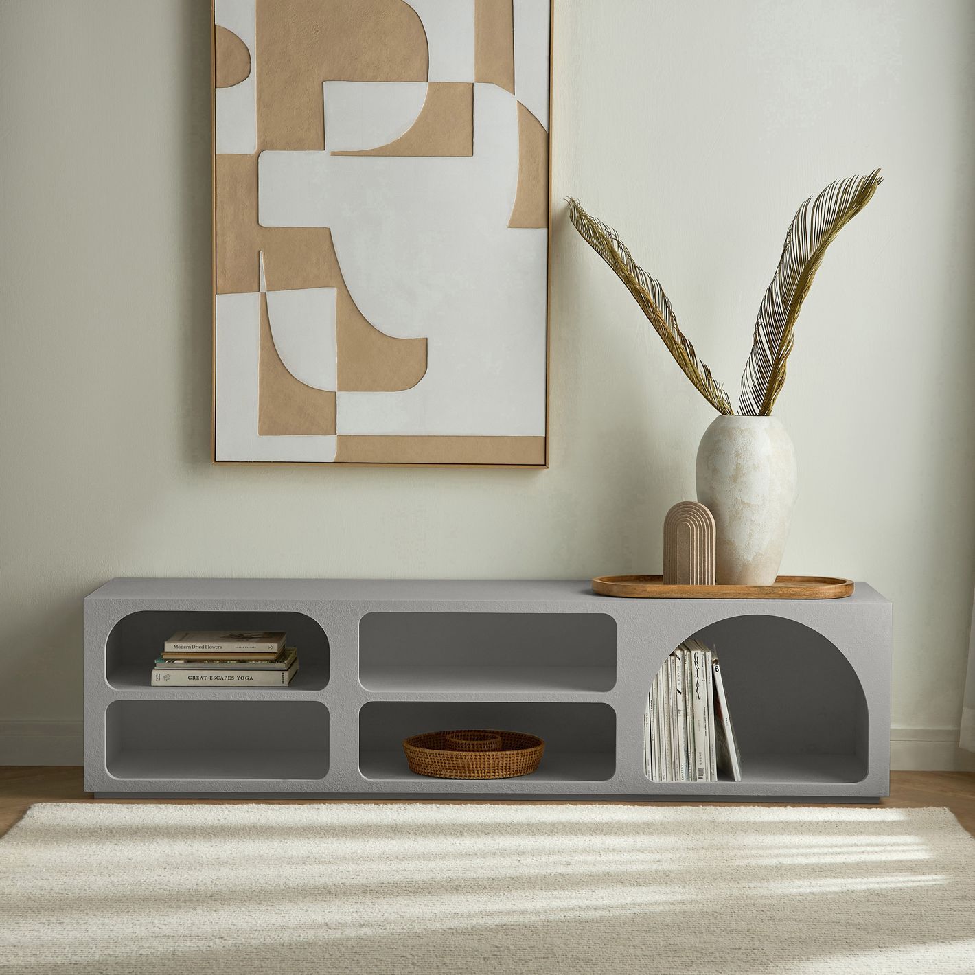 Two open shelves provide ample space for consoles, remotes, and accessories, ensuring your area stays organized and clutter-free