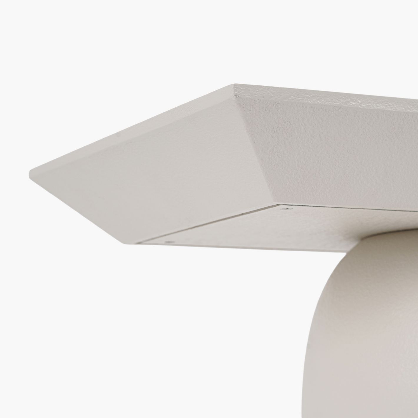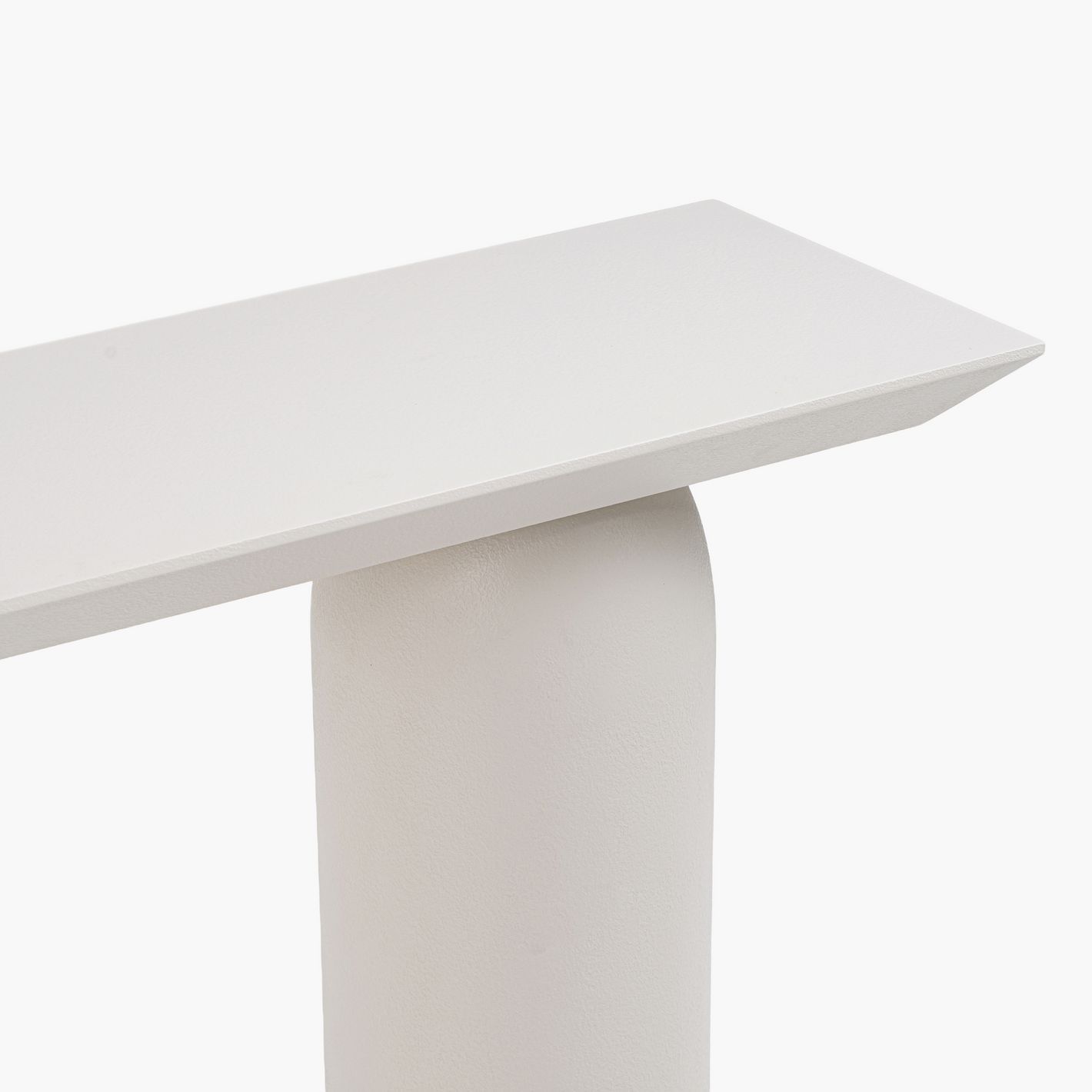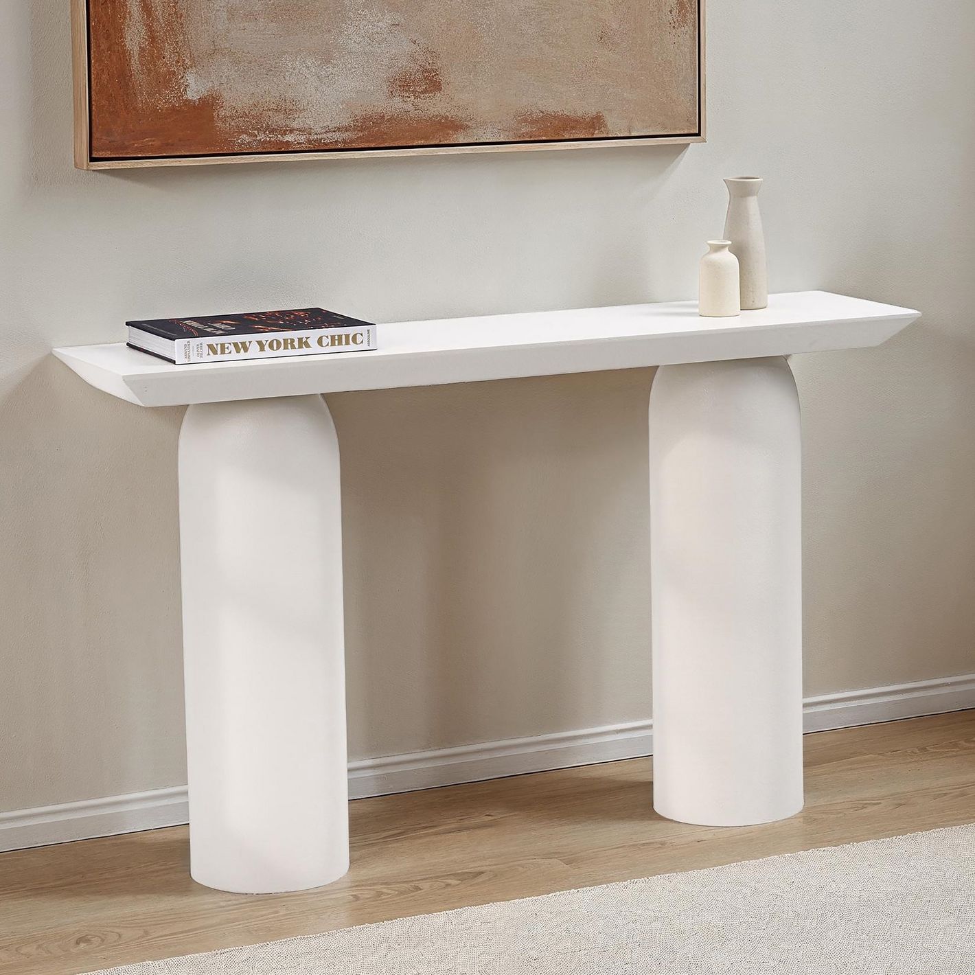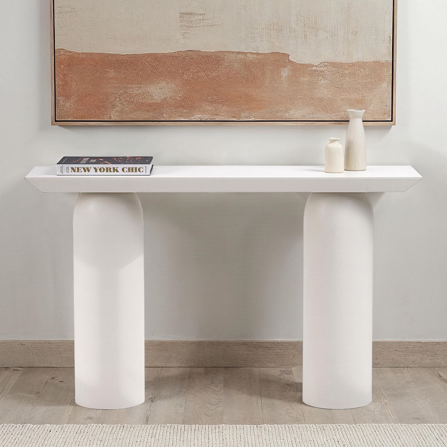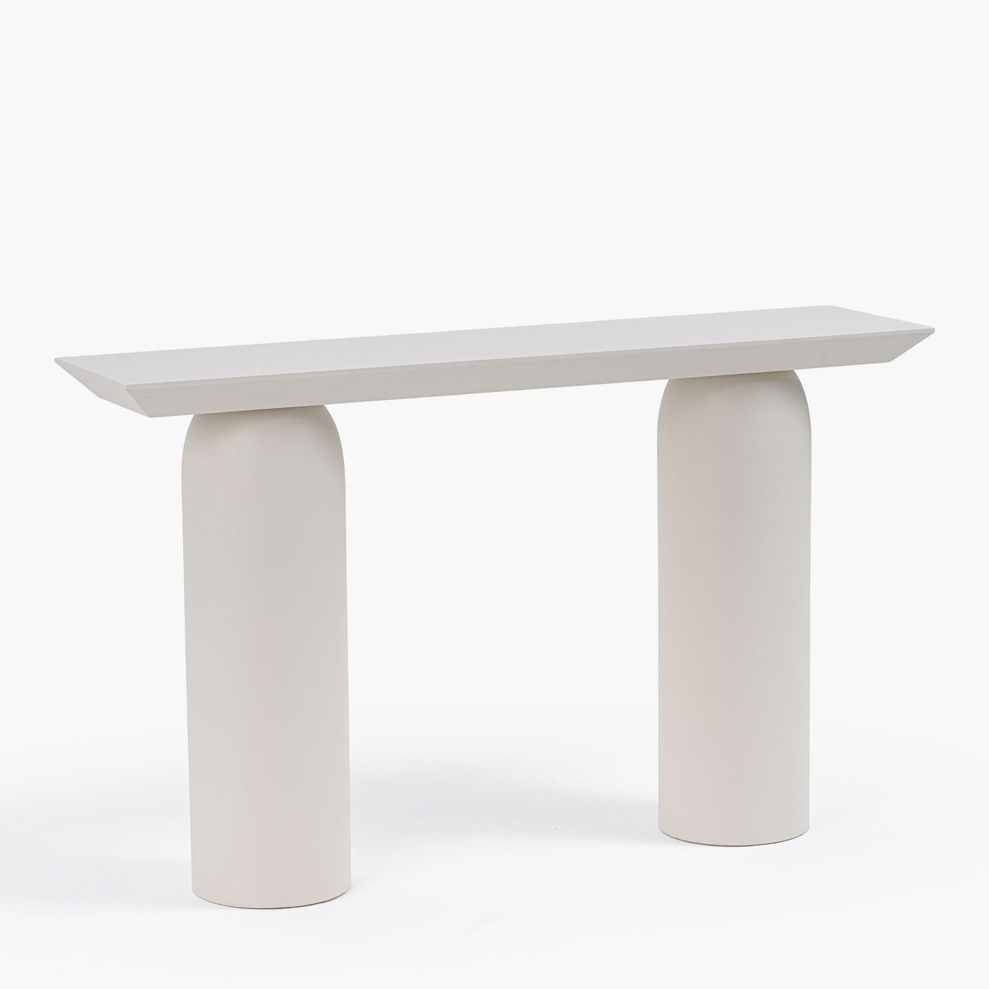 Supported by two rounded pillar legs with a smooth plaster finish, this console features a bold chamfered-edge top that adds depth and sophistication