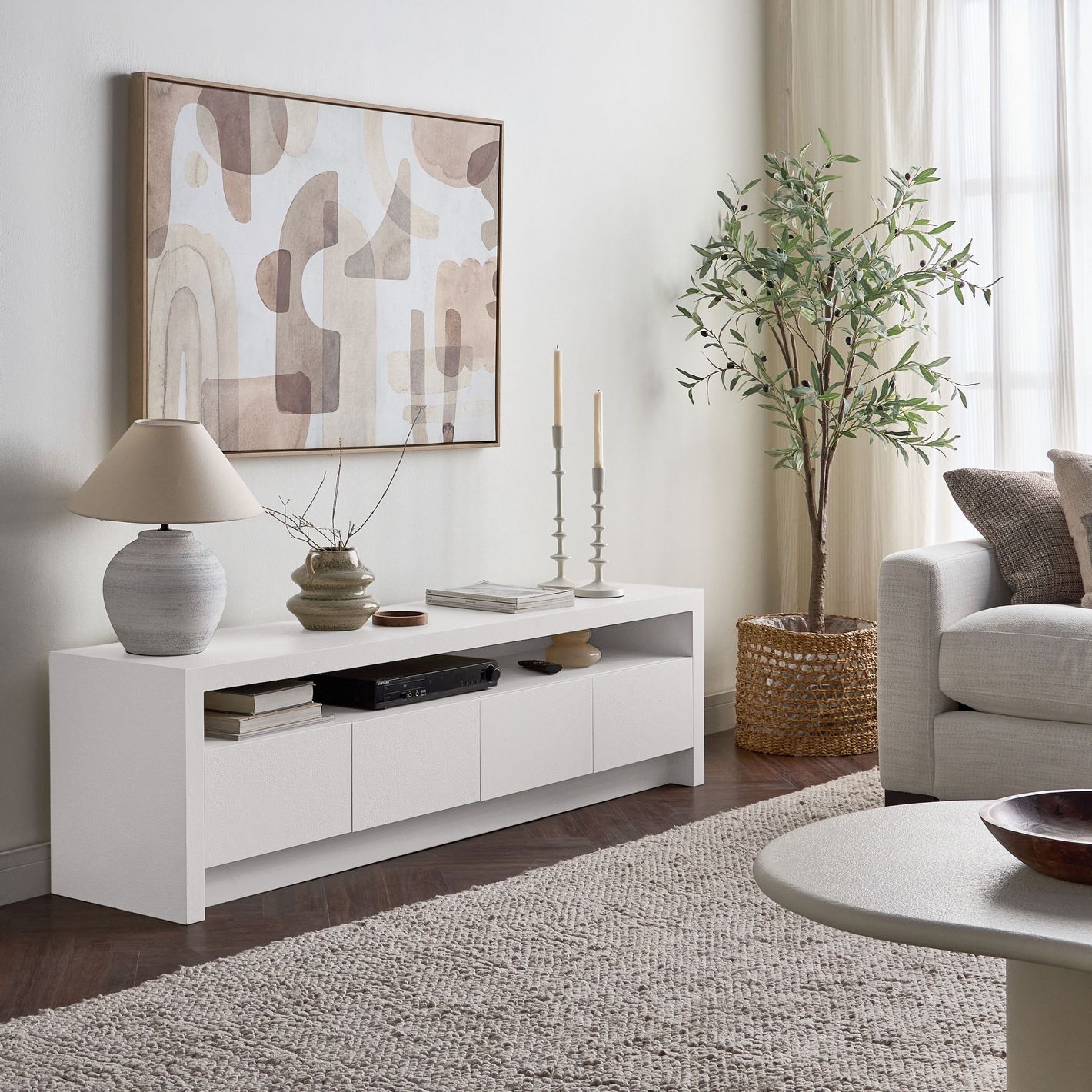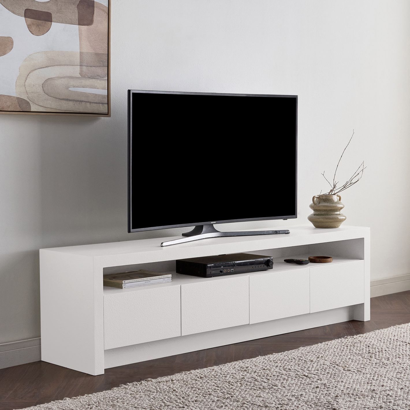 Its clean lines and smooth surfaces create a minimalist aesthetic, while four spacious drawers and an open shelf provide ample storage for media devices, décor, and accessories