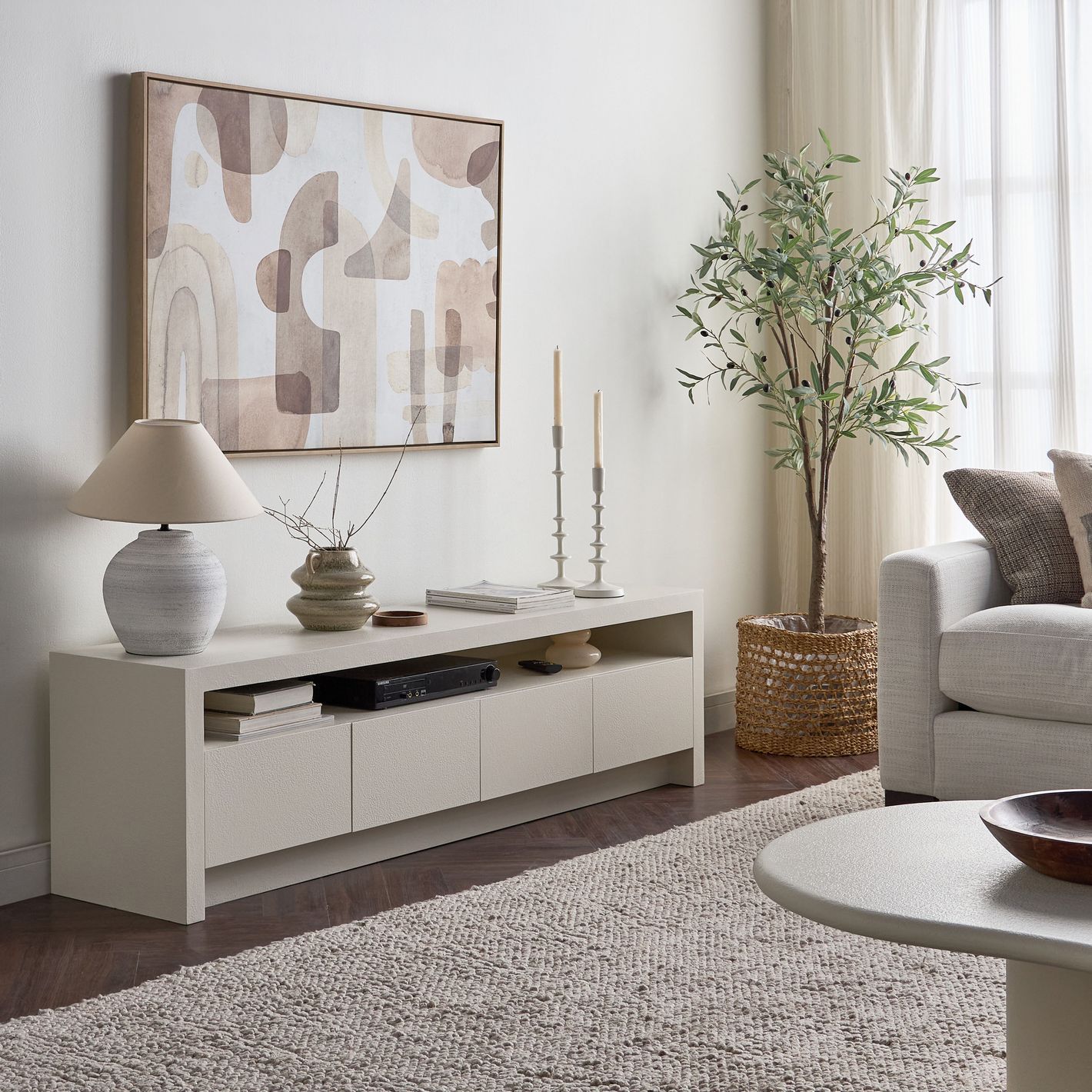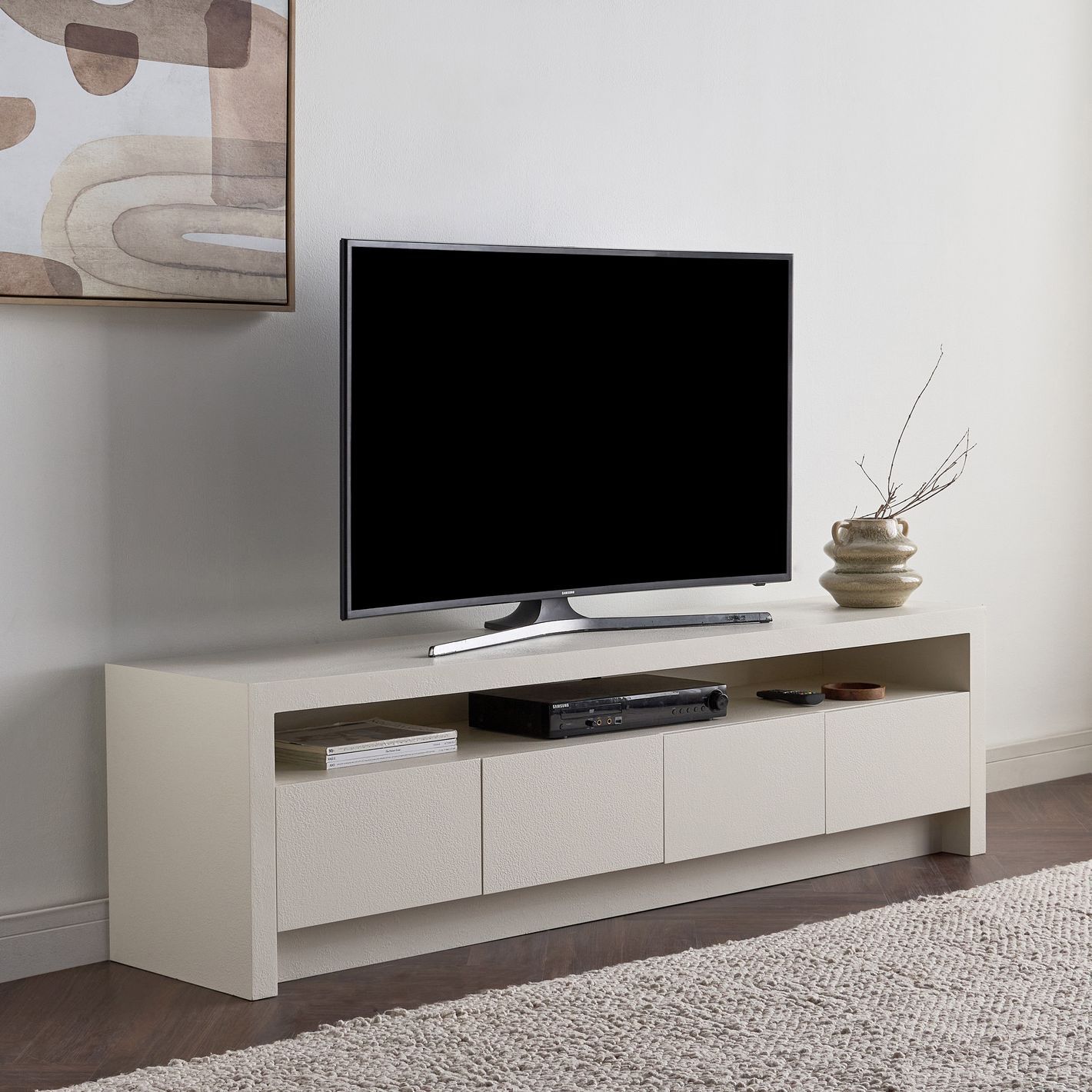 The clean lines and smooth surfaces create a sophisticated look, while four spacious drawers and an open shelf provide ample storage for devices, remotes, and accessories