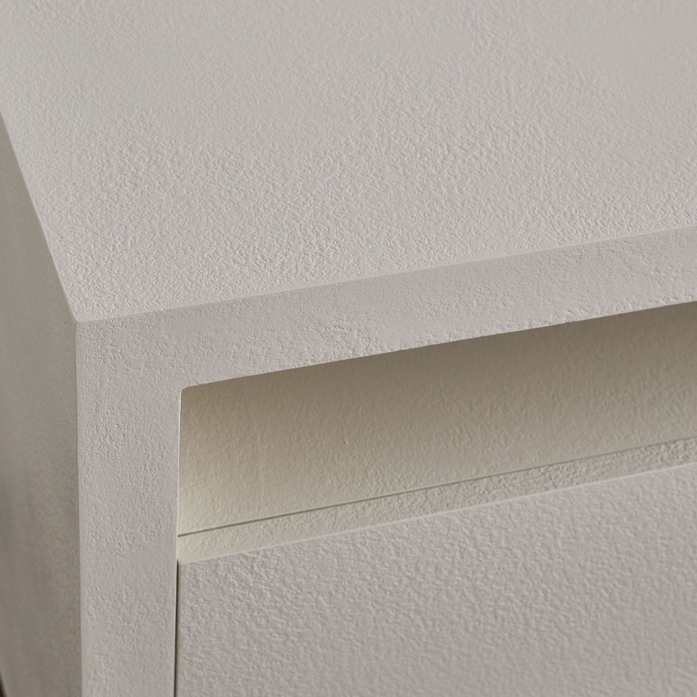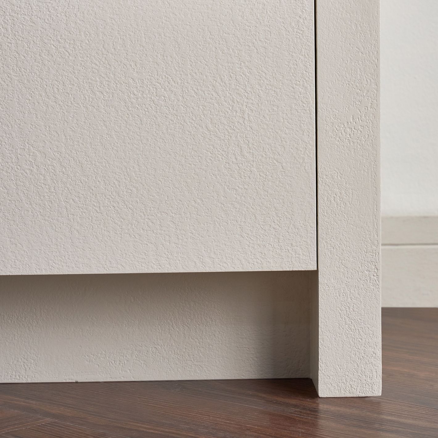 Crafted from high-quality MDF with durable engineered wood legs, this unit features a refined plaster finish that enhances its minimalist charm