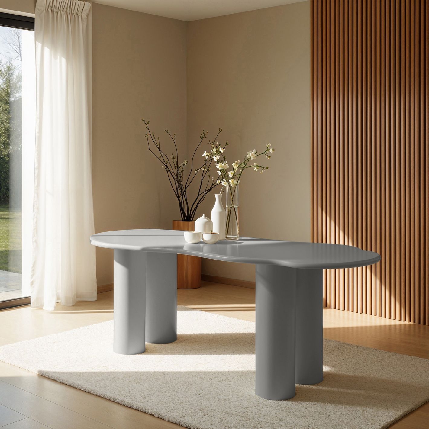 Its wave-like tabletop paired with sturdy cylindrical legs creates a striking visual that blends art with functionality