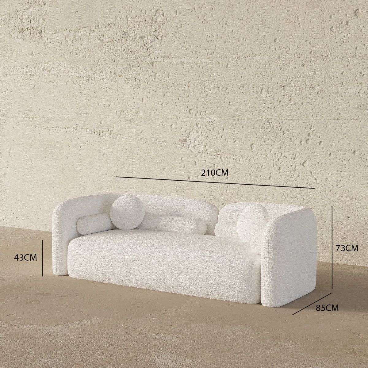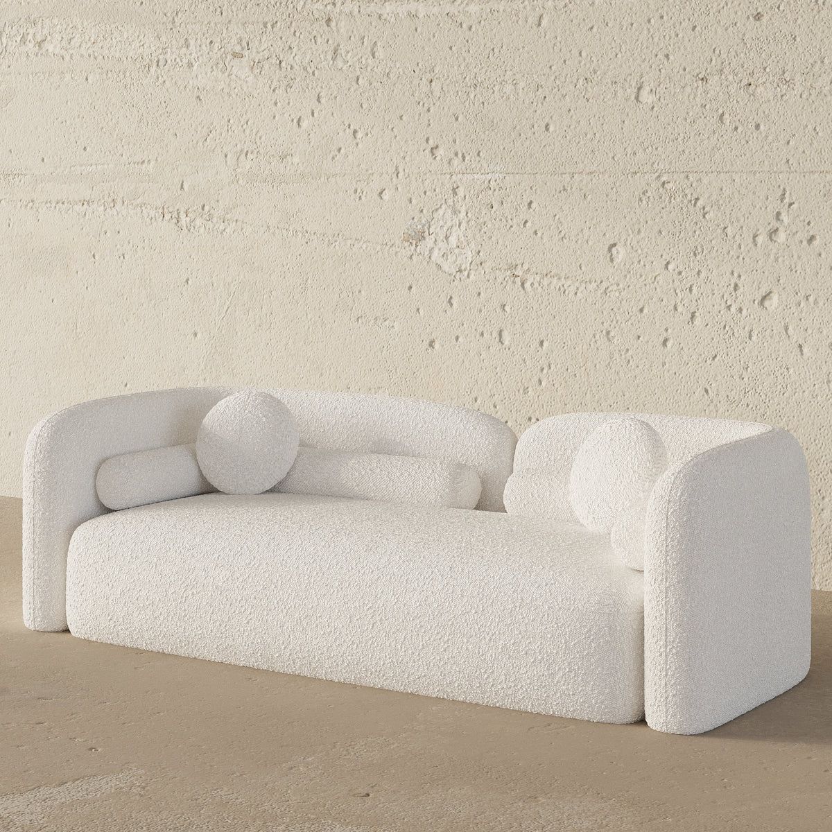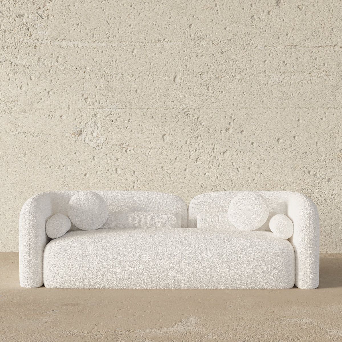 This 2 Seater Sofa features soft boucle upholstery, curved corners, and a solid wood frame, combining durability with sophisticated design