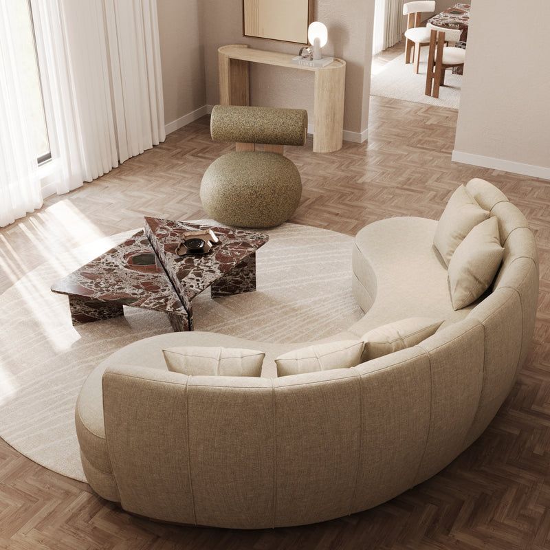 This curved sofa features a distinctive wavy silhouette and soft beige woven fabric, adding warmth and flow to any living space