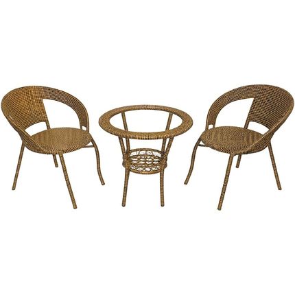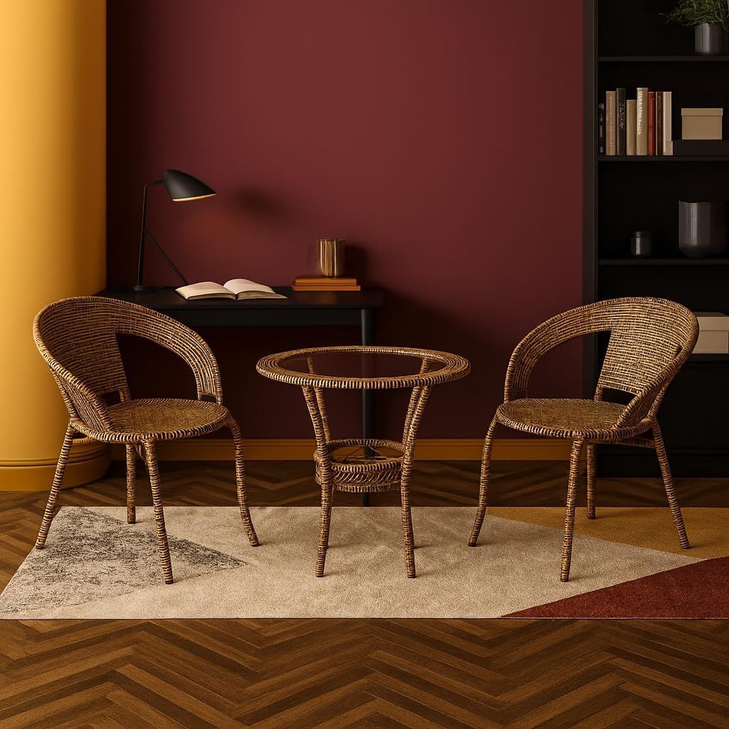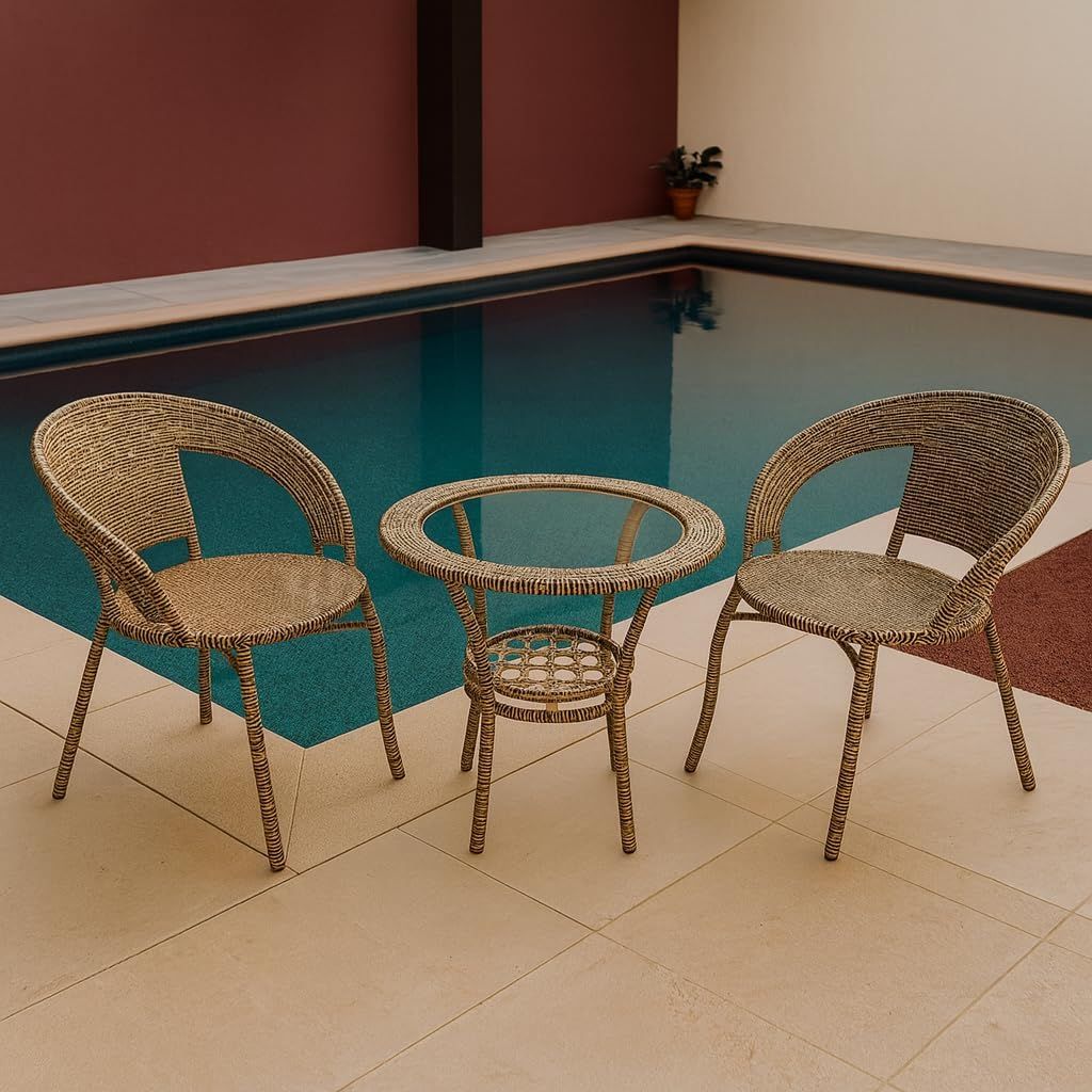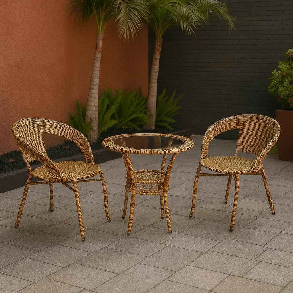 Rattan Chair Set | Patio Seating Set with 1 Table & 2 Chairs | Durable Artificial Rattan Set for Outdoor & Indoor Use, Comfortable | Armchair for Garden & Pool-Side Furniture (Golden)