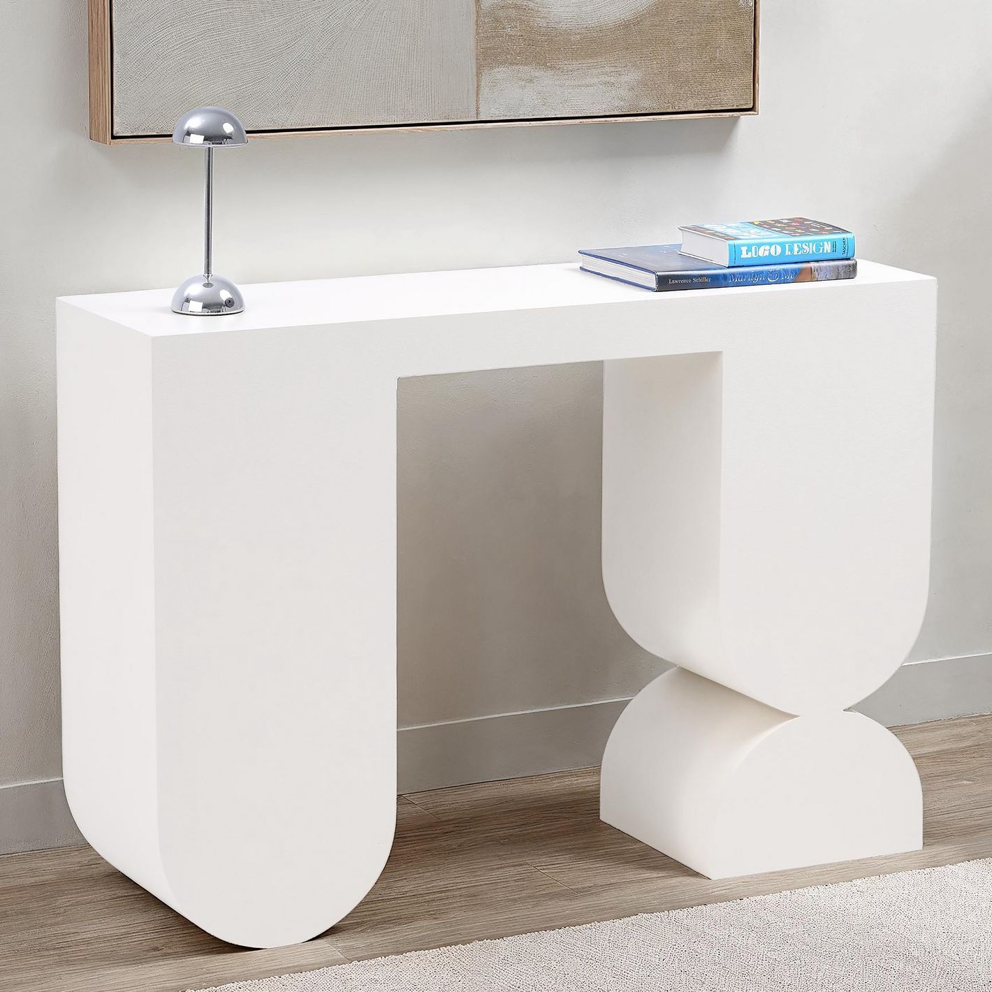 Perfect for entryways, hallways, or living spaces, this console offers a versatile surface for displaying décor, lamps, or essentials while doubling as a statement of modern art
