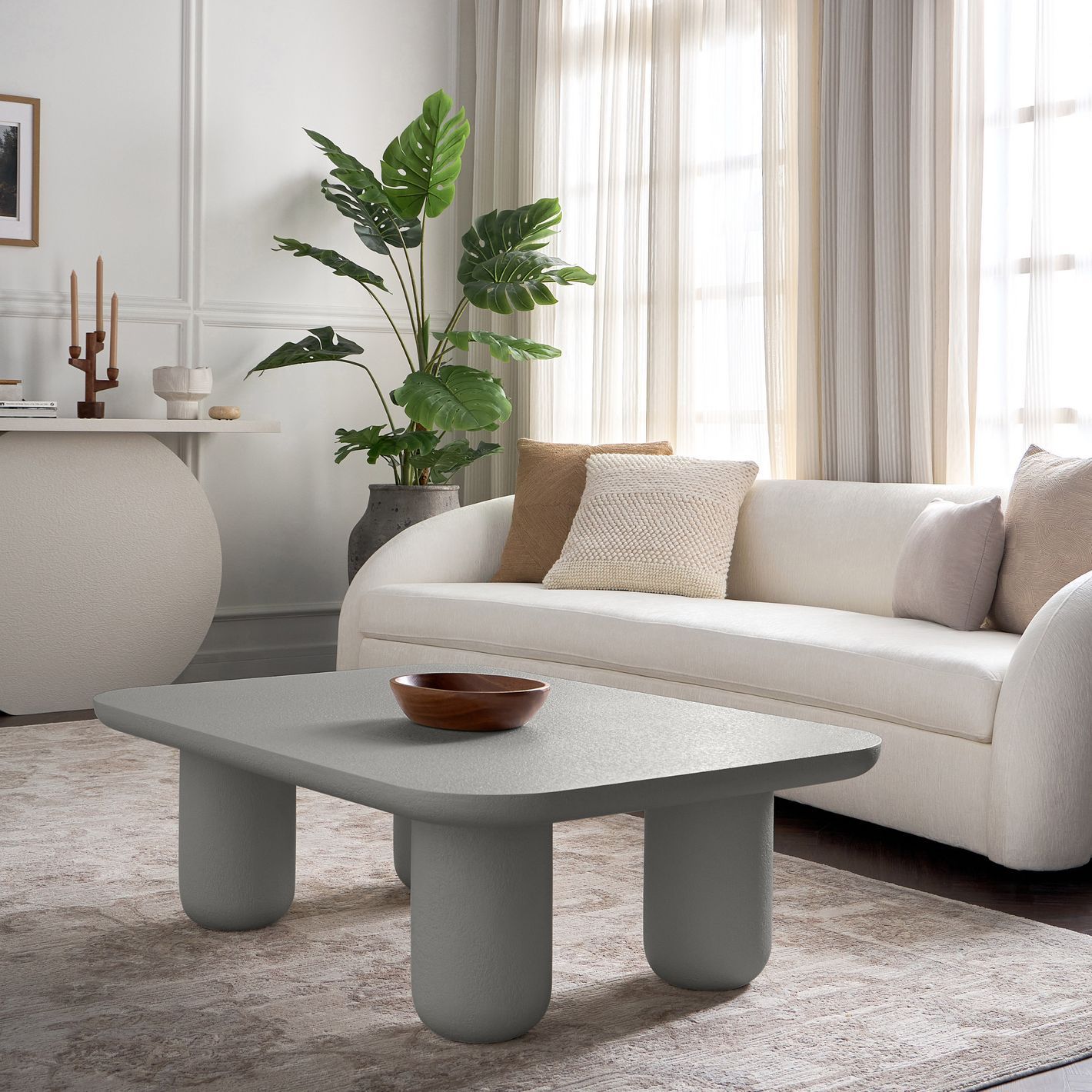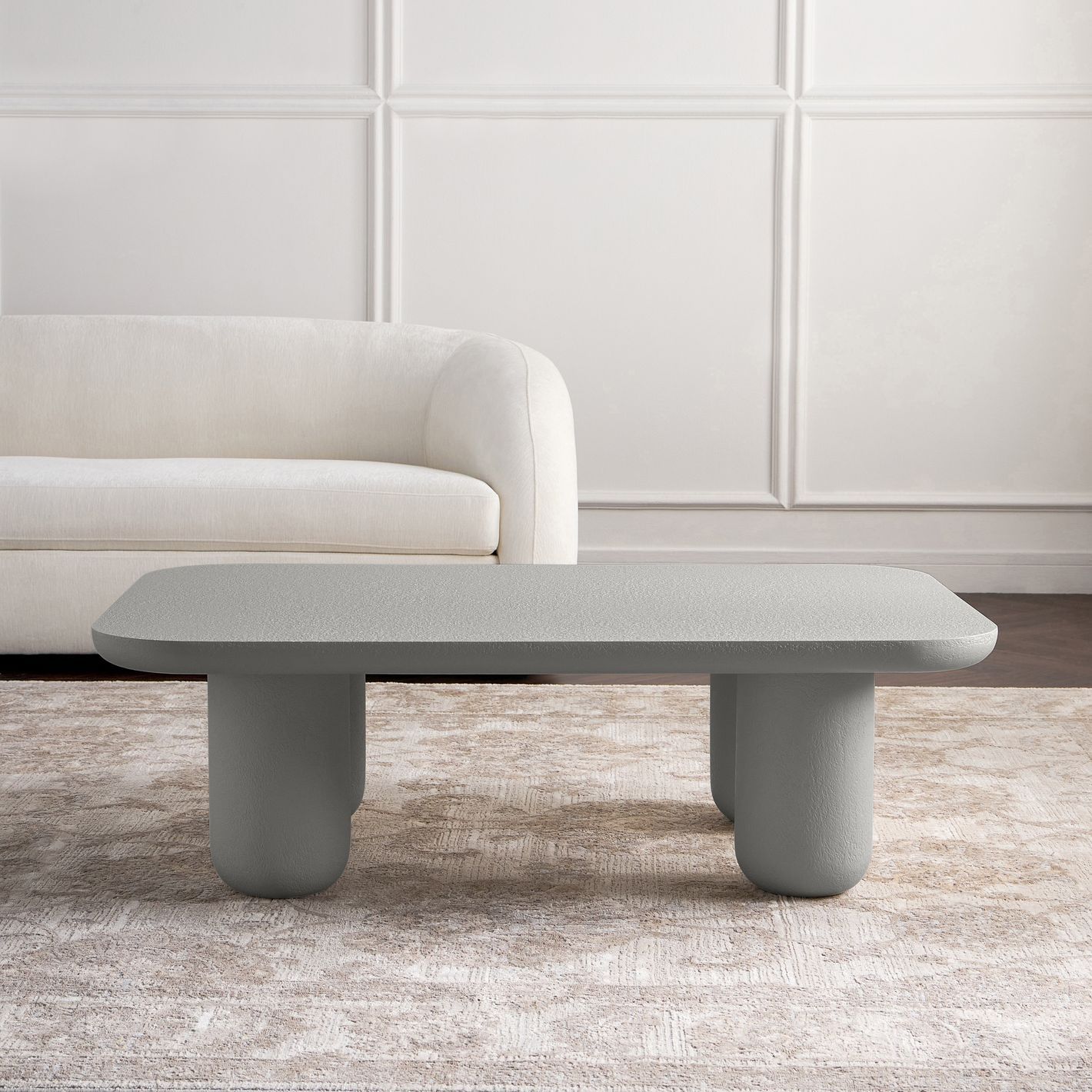 Its smooth edges and distinctive textured finish bring modern sophistication to any interior, while the sturdy cylindrical legs provide exceptional stability and long-lasting durability