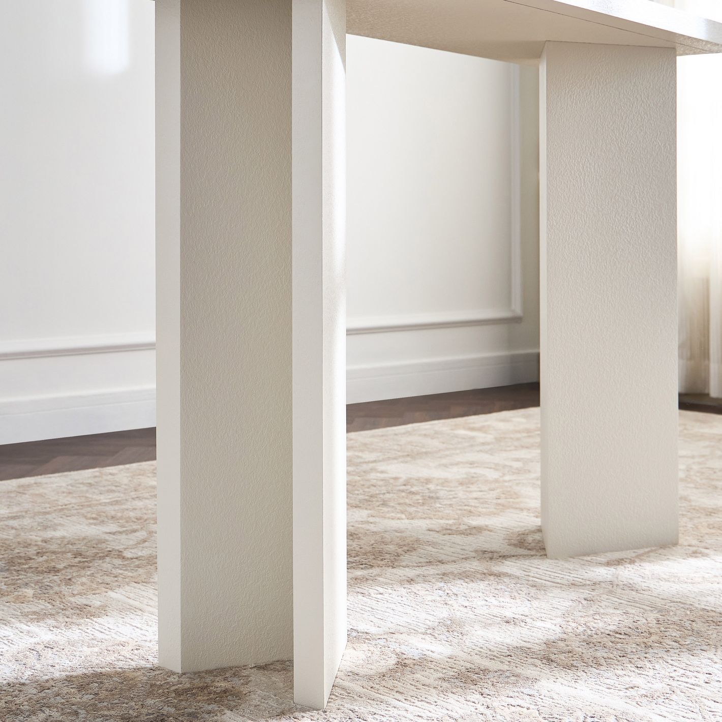Its sleek rectangular surface provides ample space for displaying décor, lamps, or essentials, while the sturdy pedestal legs ensure long-lasting stability