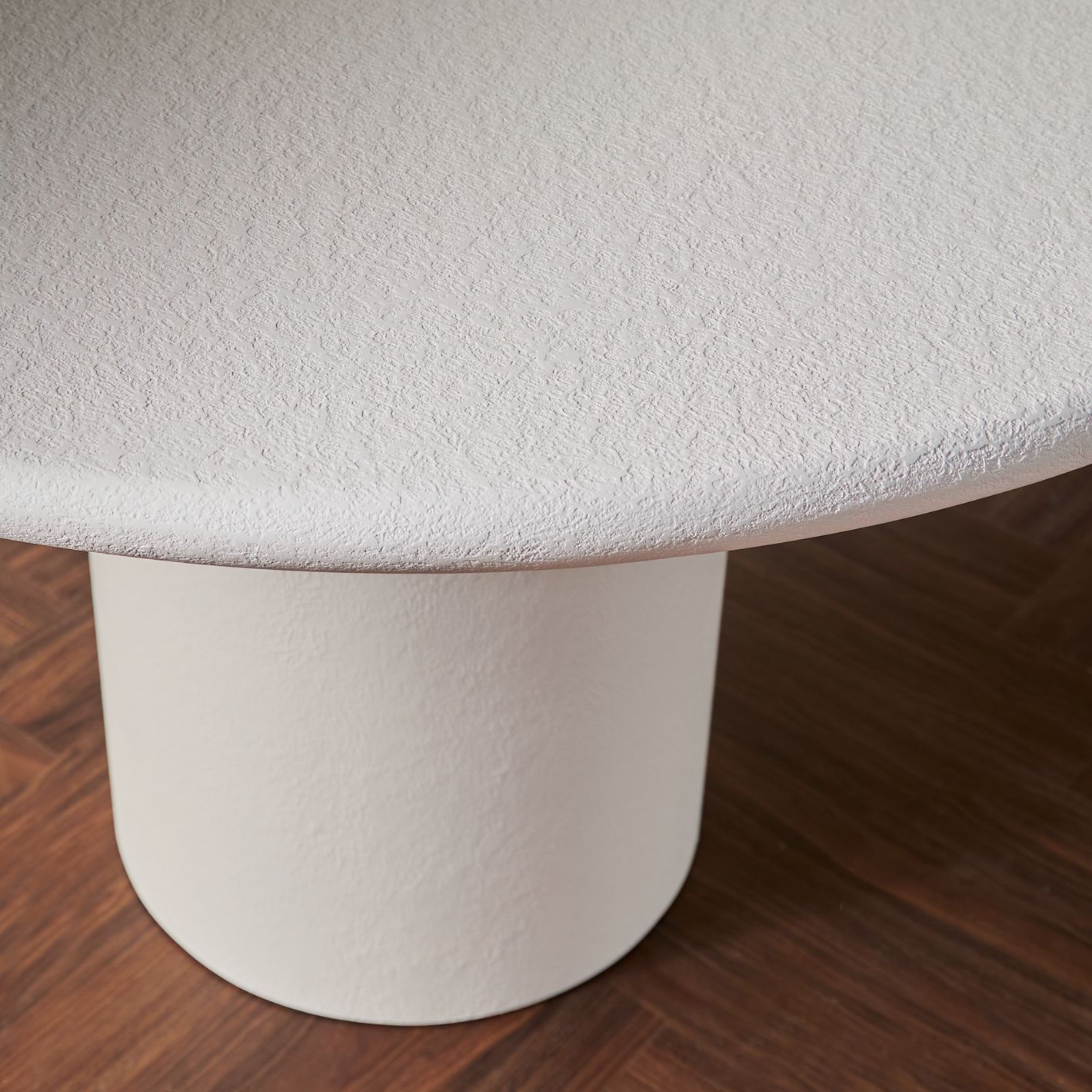 Its light-toned finish brightens interiors, while the rounded tabletop and stable pedestal base offer both elegance and practicality