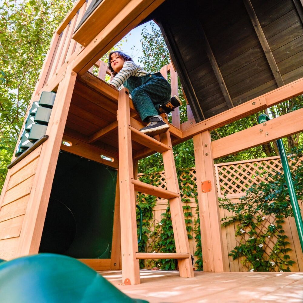 Rock wall ladder leads up to the second level with tic-tac-toe game and crow's nest with telescope.