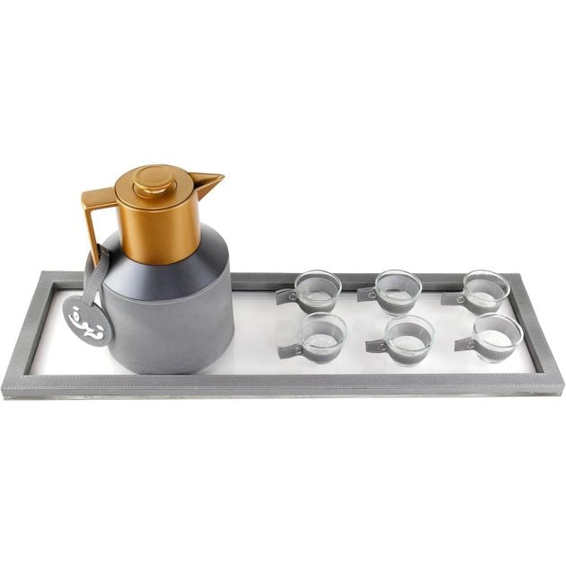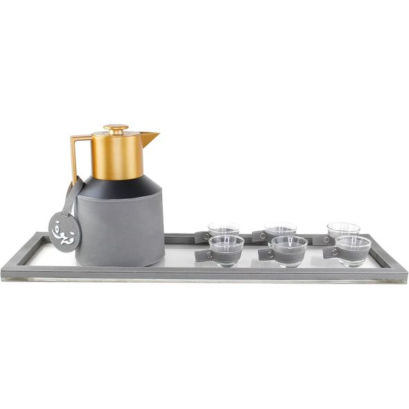 The product LAMSIT IBDAA Coffee Thermo Flask | Coffee and Tea Vacuum Pot - 1.0 Litre Dallah Arabic Carafe – Drink Cups – Leather Hospitality Set - Heat Insulated Dalla (Grey, Set of Coffee with rectangle tray) images have props used for illustrative purposes. Product Color may vary slightly due to photographic lighting or your screen settings.