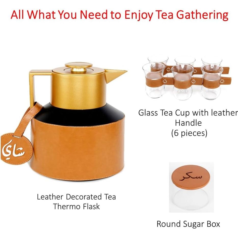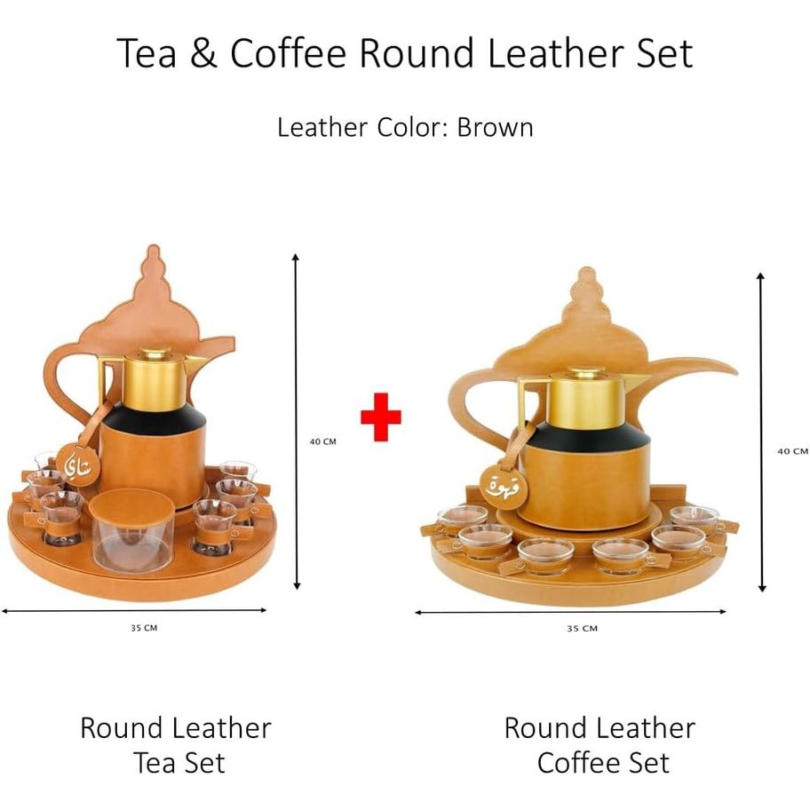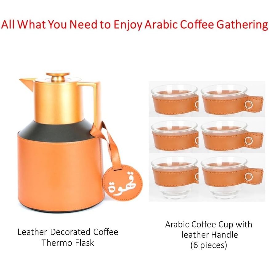 LAMSIT IBDAA Coffee Thermo Flask – Tea Vacuum Pot - Heat Insulated Thermos – Arabic Carafe – Jug Dalla – Drink Cups – Round Leather Set (Brown)