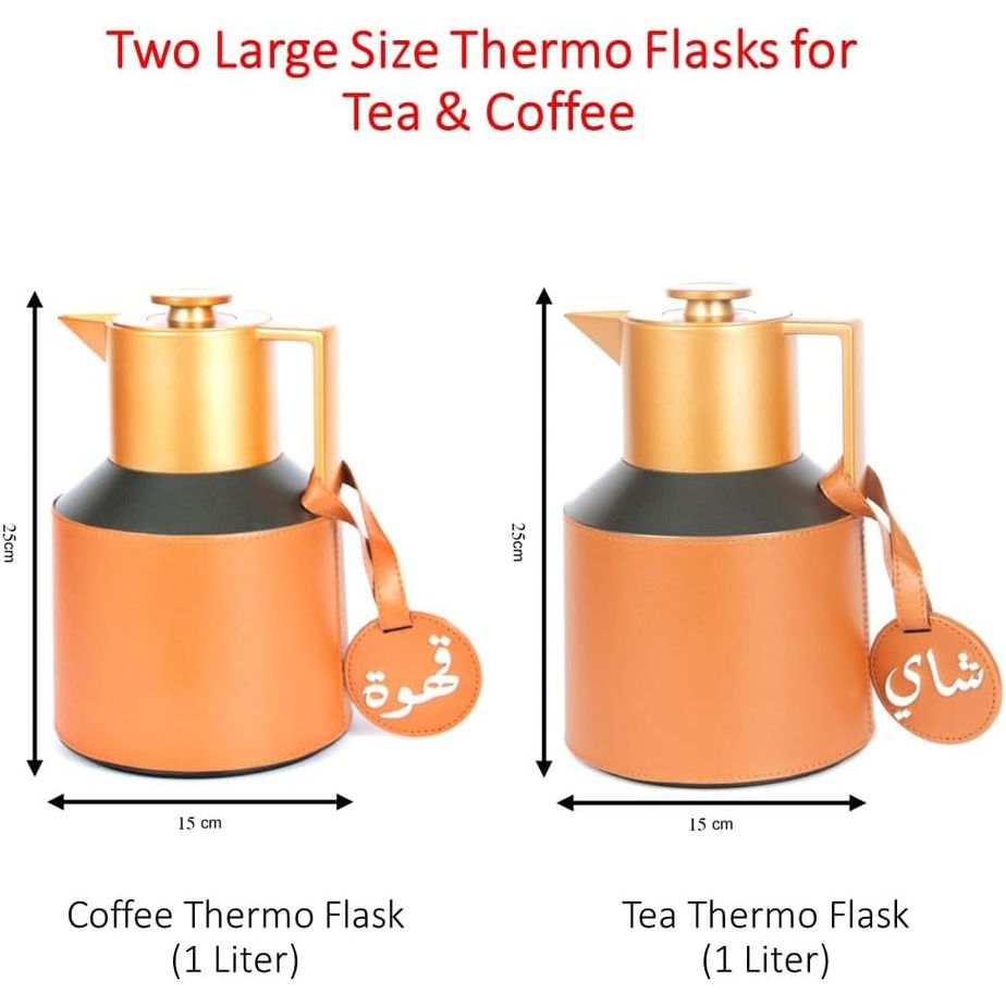 Celebrate the timeless tradition of Arabic hospitality with this beautifully designed combo set. Each thermos is wrapped in luxurious PU leather and adorned with Arabic calligraphy tags for Tea and Coffee. Available in three elegant colors: Brown, Off-White, and Grey.