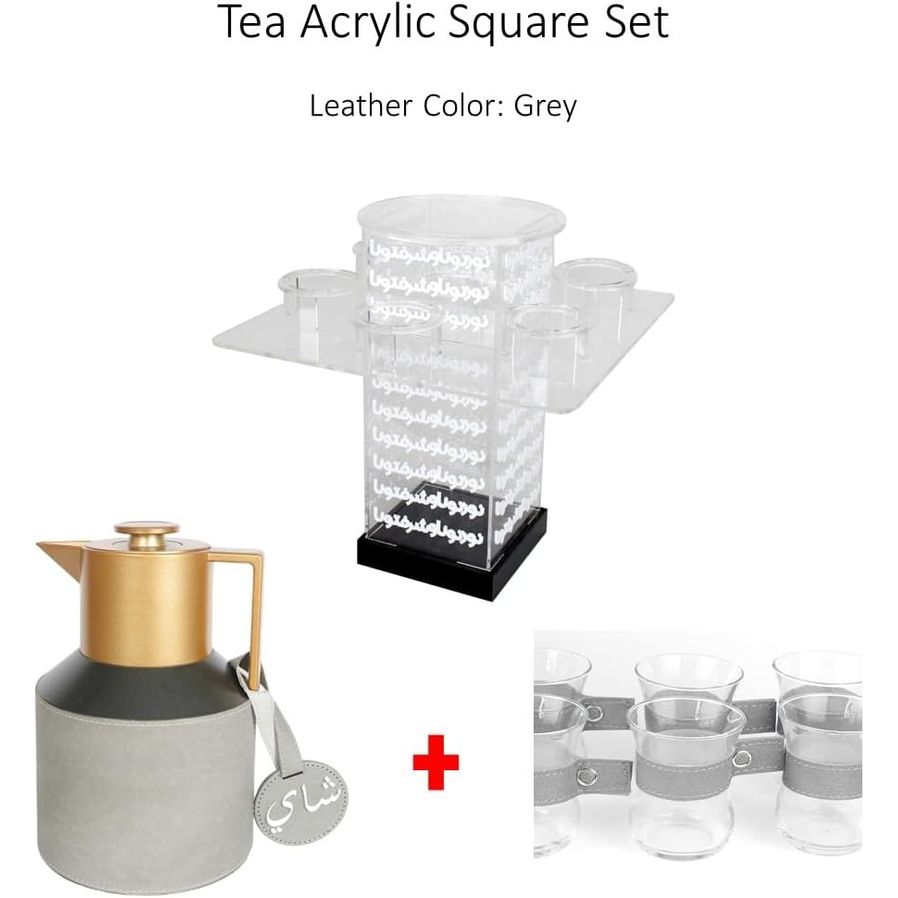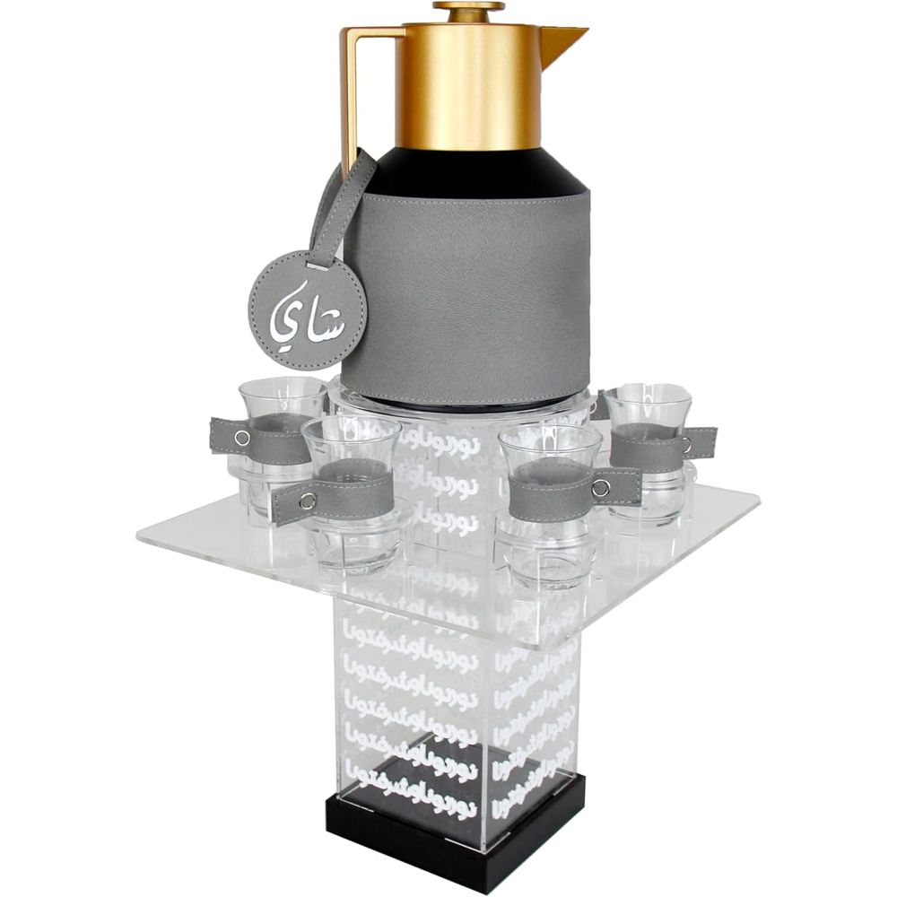 LAMSIT IBDAA Coffee Thermo Flask – Tea Vacuum Pot - Heat Insulated Thermos – Arabic Carafe – Jug Dalla – Drink Cups – Square Acrylic Set (Grey, Tea Set), LI 105