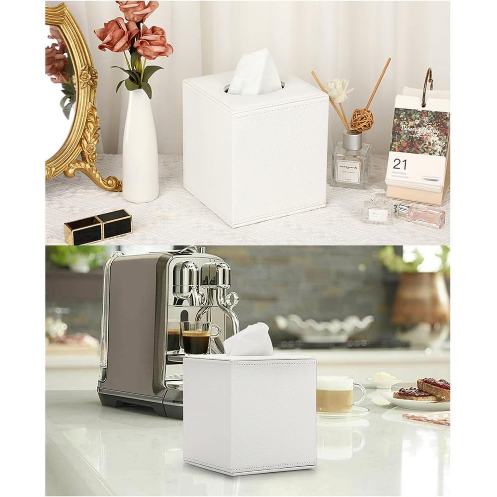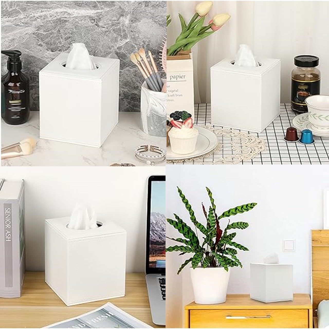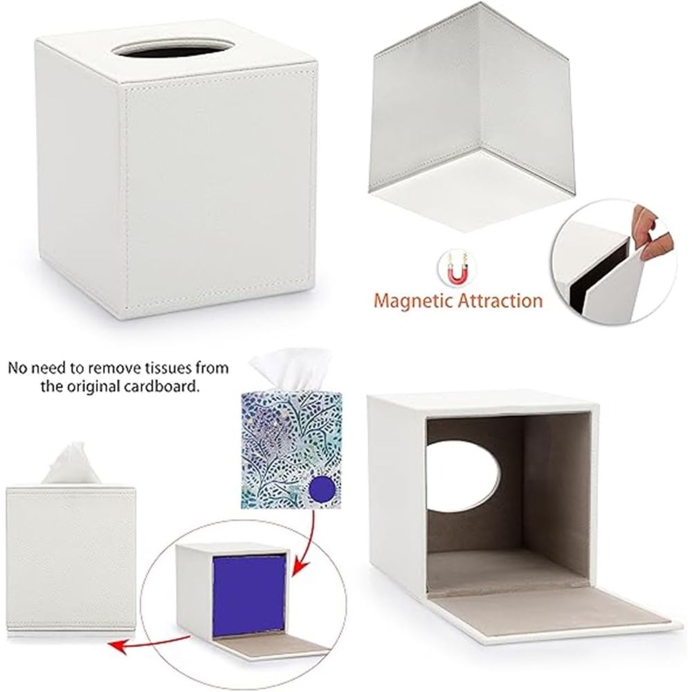 LAMSIT IBDAA Leather Tissue Box Holder with Magnetic Bottom Rectangular Napkin Facial Tissues Dispenser Square Cover PU Leather Modern Organizer for Home Office Desk Car (White, Cubic)
