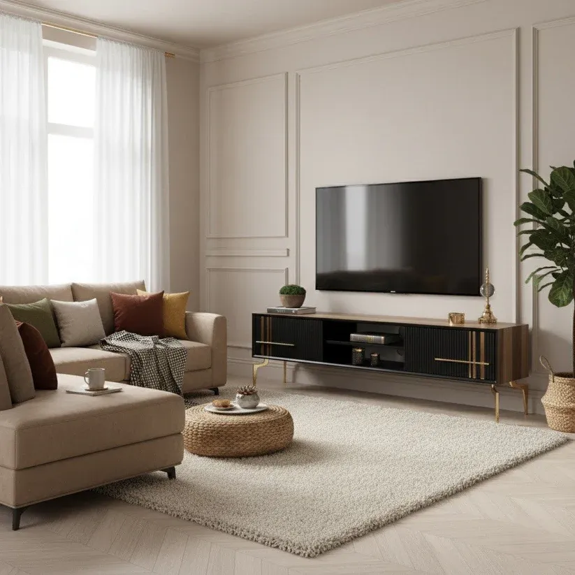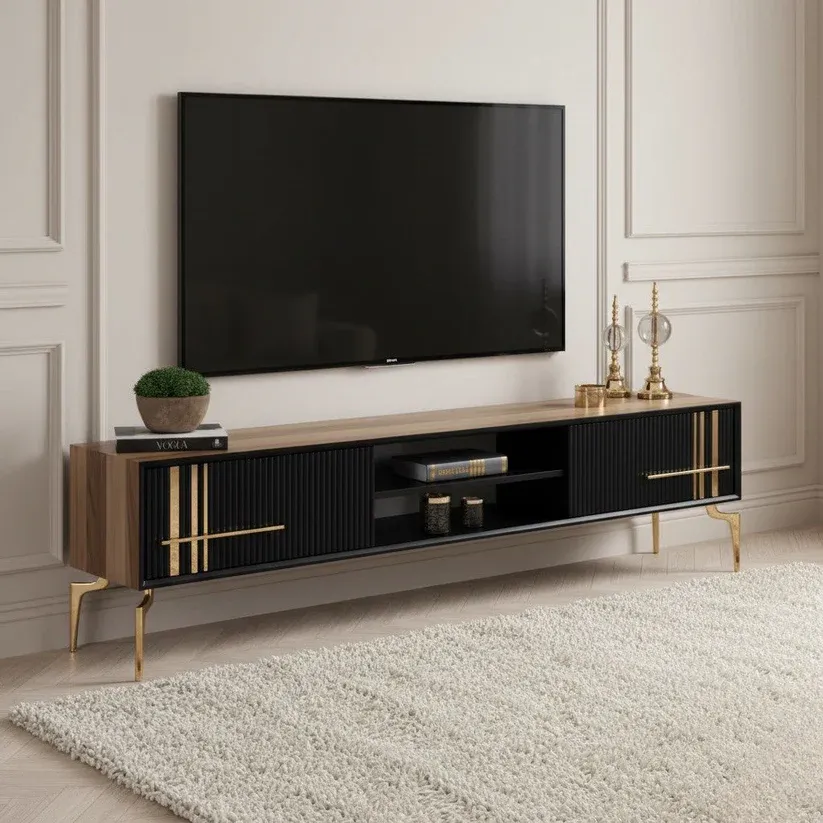 With its 200cm width, it comfortably accommodates large-screen TVs while maintaining a stable and sturdy base. The spacious drawers provide ample storage for remotes, DVDs, and accessories, keeping your space clutter-free. The open middle compartment includes a cable management hole, making it easy to set up gaming consoles, media players, or sound systems while ensuring neat and organized wiring.
