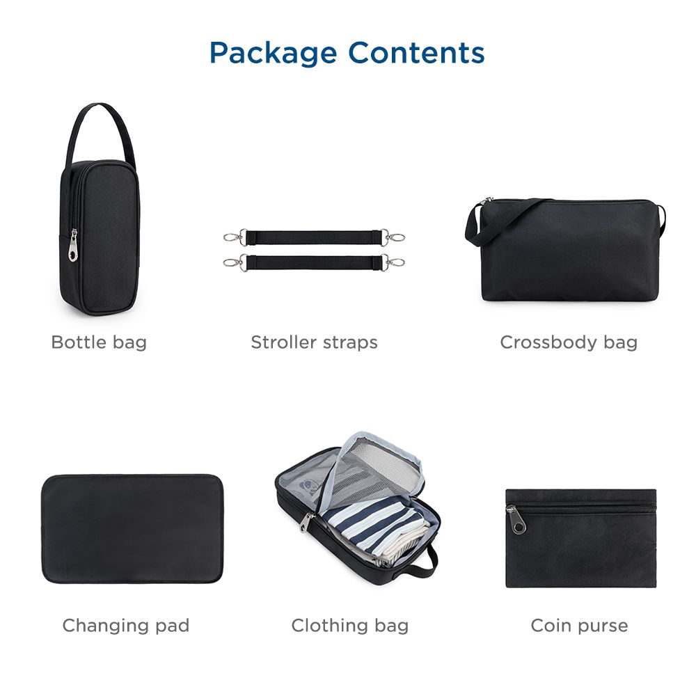 1- Diaper Bag, 1- Bottle Bag, 1- Crossbody Bag, 1- Clothing Bag, 1- Coin Purse, 1- Changing Mat, 1- Set Stroller Straps