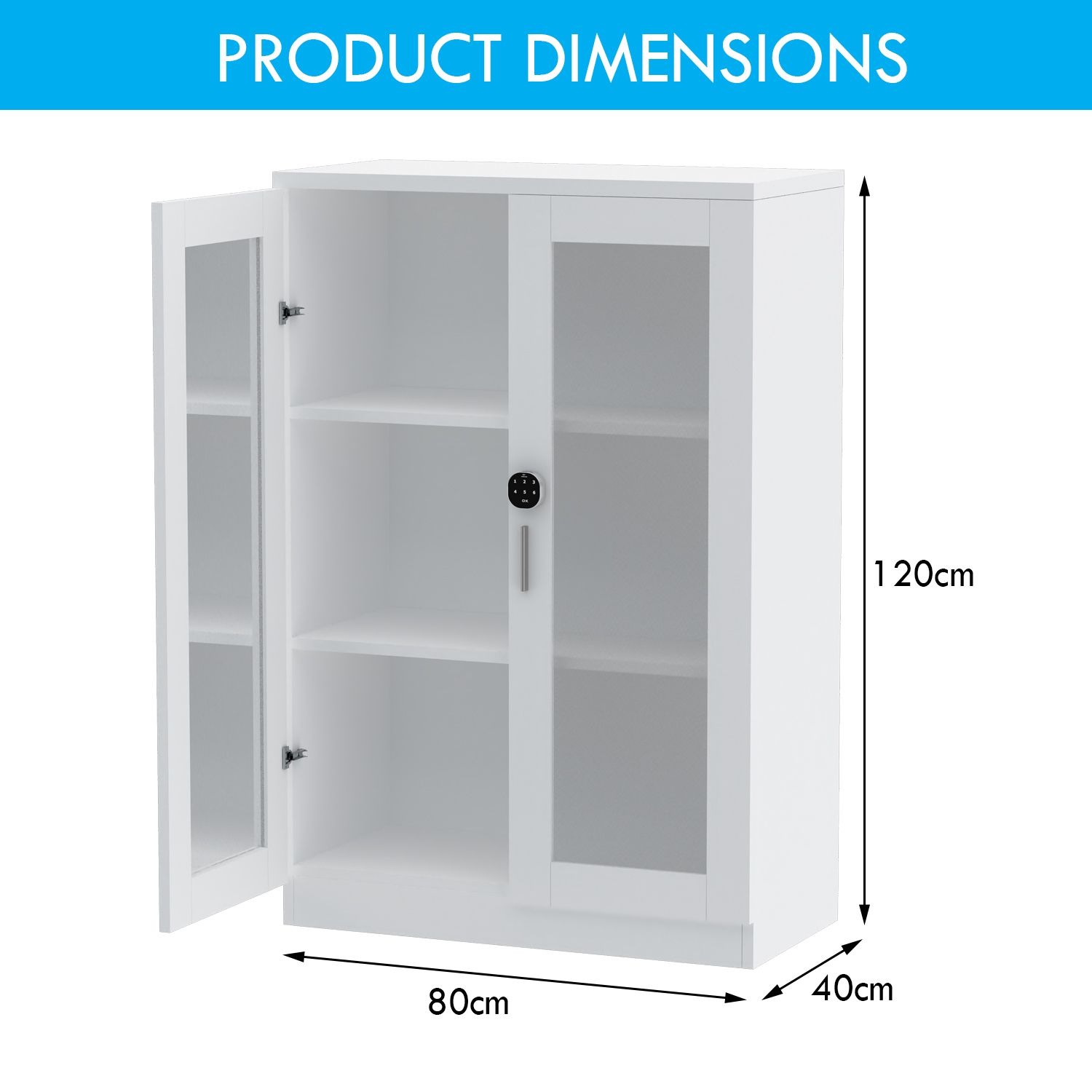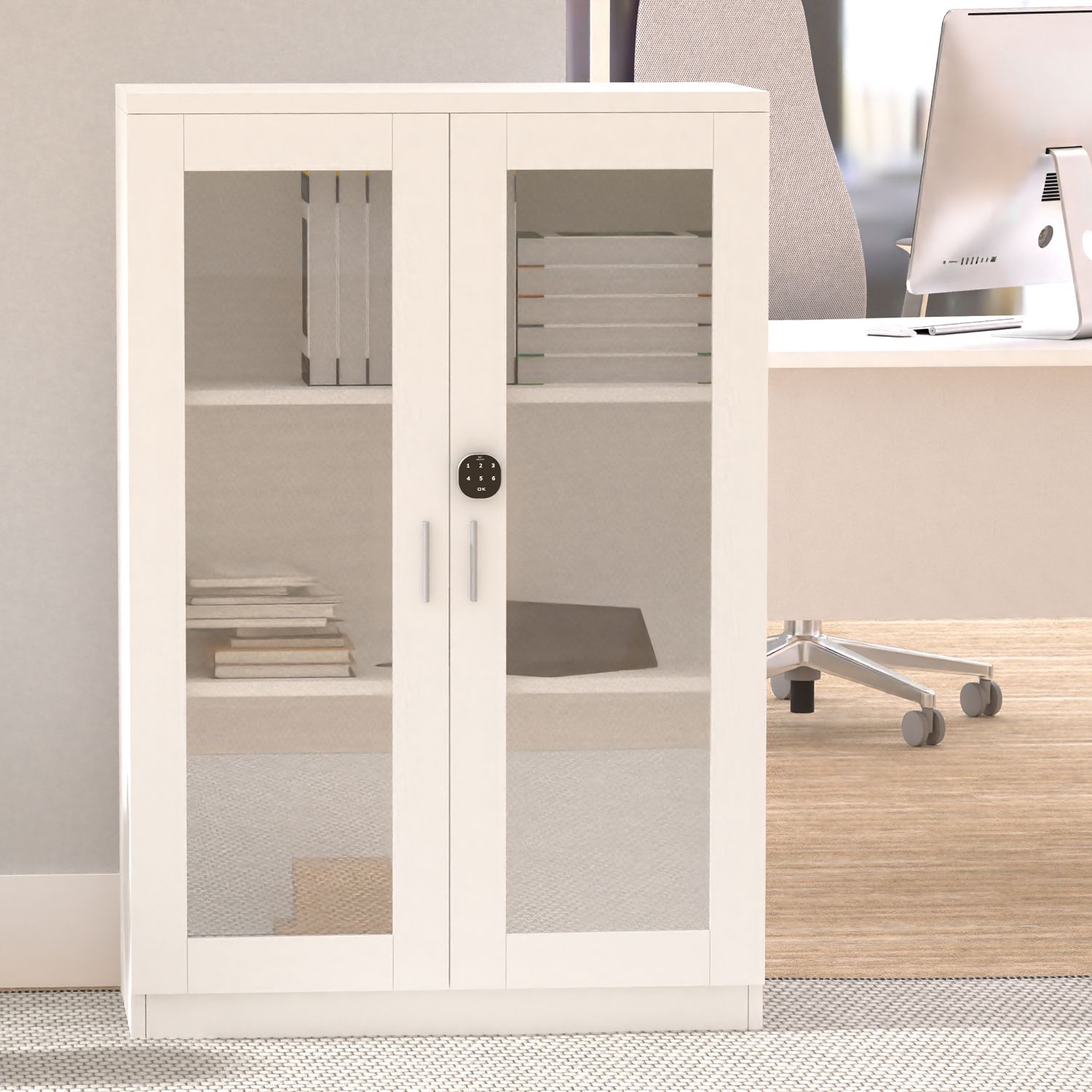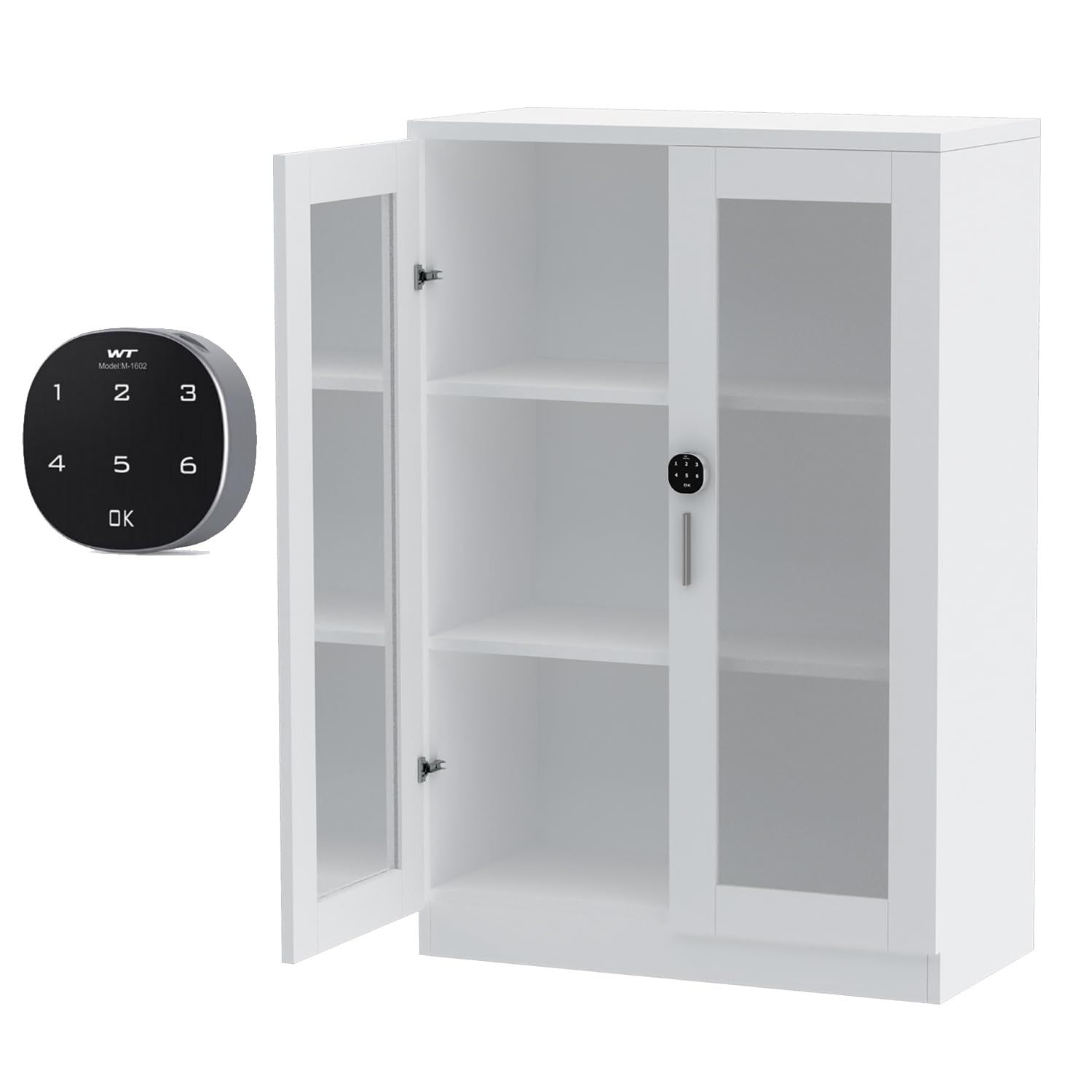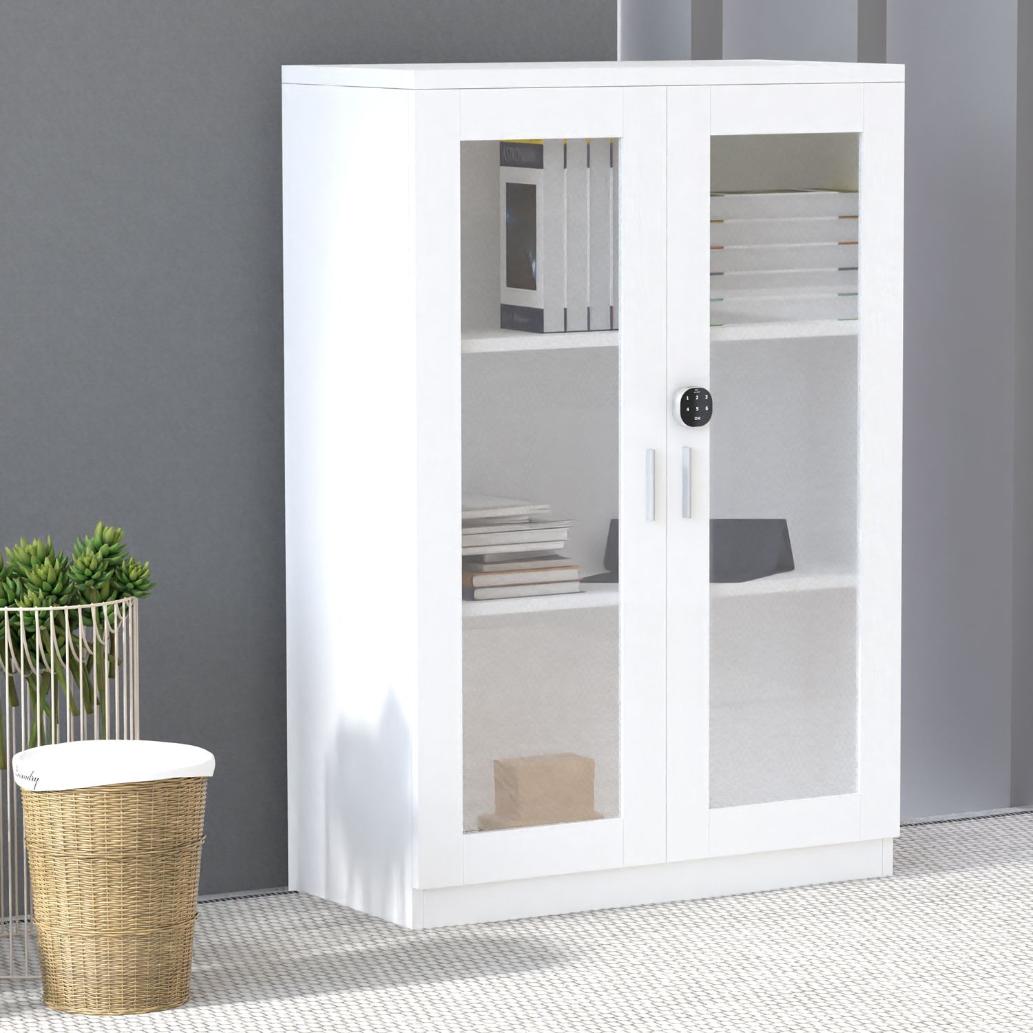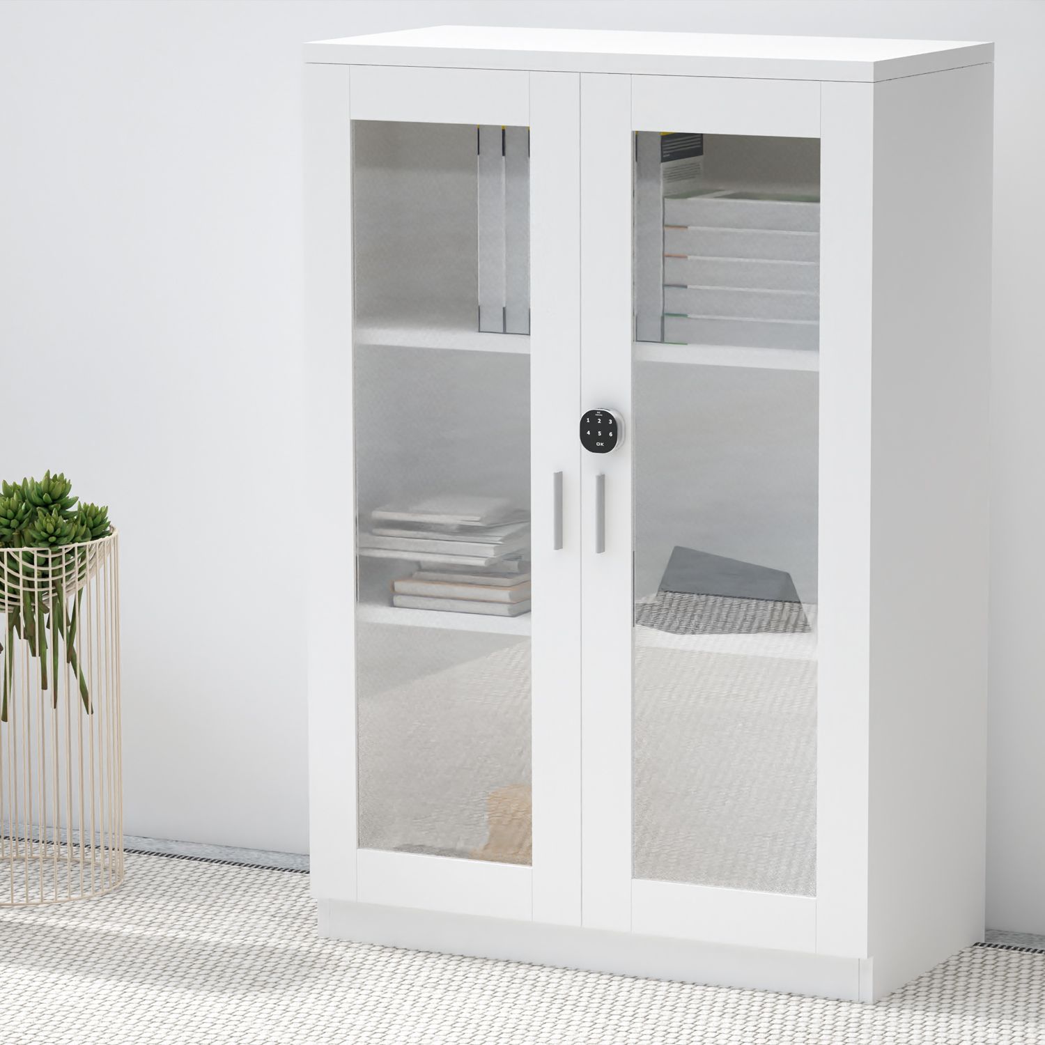 Mahmayi Carre 120 Medium Height Cabinet with Digital Lock Stylish Storage Solution for Home and Office Organization with 2 Shelves, Glass Door - White