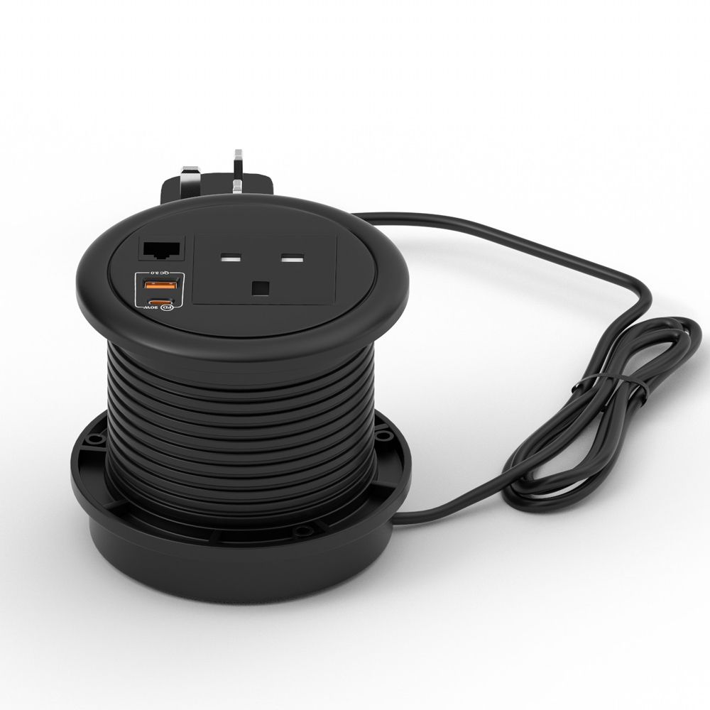 Mahmayi Modern Recessed Power Socket with Wire Desk Power Strip C Outlet, USB-A, USB-C, and LAN Network Efficient Charging Ideal for Home and Office - Black
