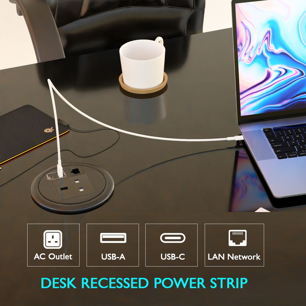 Mahmayi Modern Recessed Power Socket with Wire Desk Power Strip C Outlet, USB-A, USB-C, and LAN Network Efficient Charging Ideal for Home and Office -Black