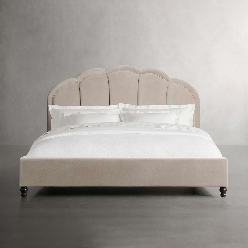 Timeless Elegance with Modern Flair: Features a charming scalloped silhouette paired with soft curves and exquisite channel-stitched detailing, blending traditional aesthetics with contemporary design. The beige velvet upholstery adds a luxurious touch, elevating the ambiance of any bedroom—from cozy family spaces to sophisticated master suites.