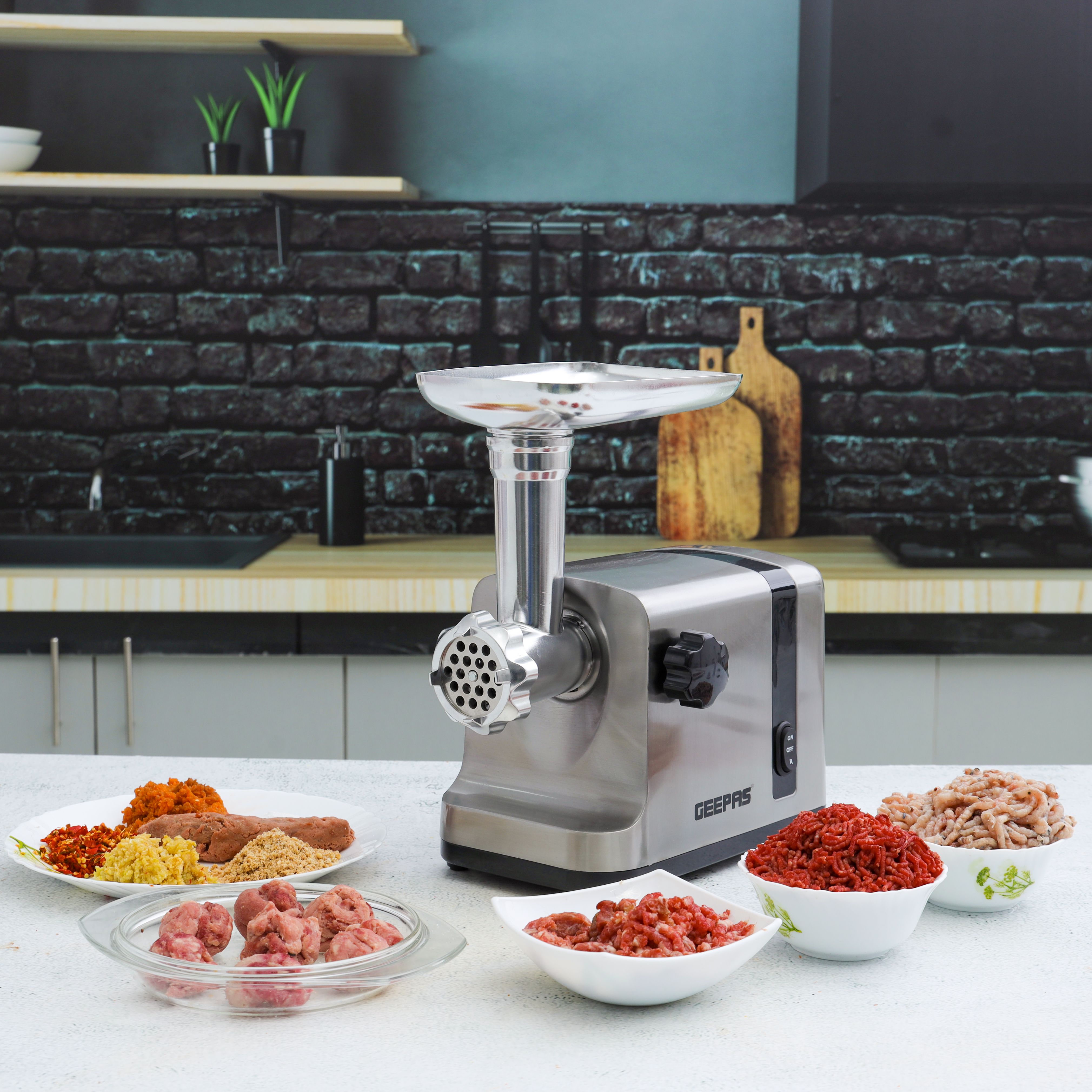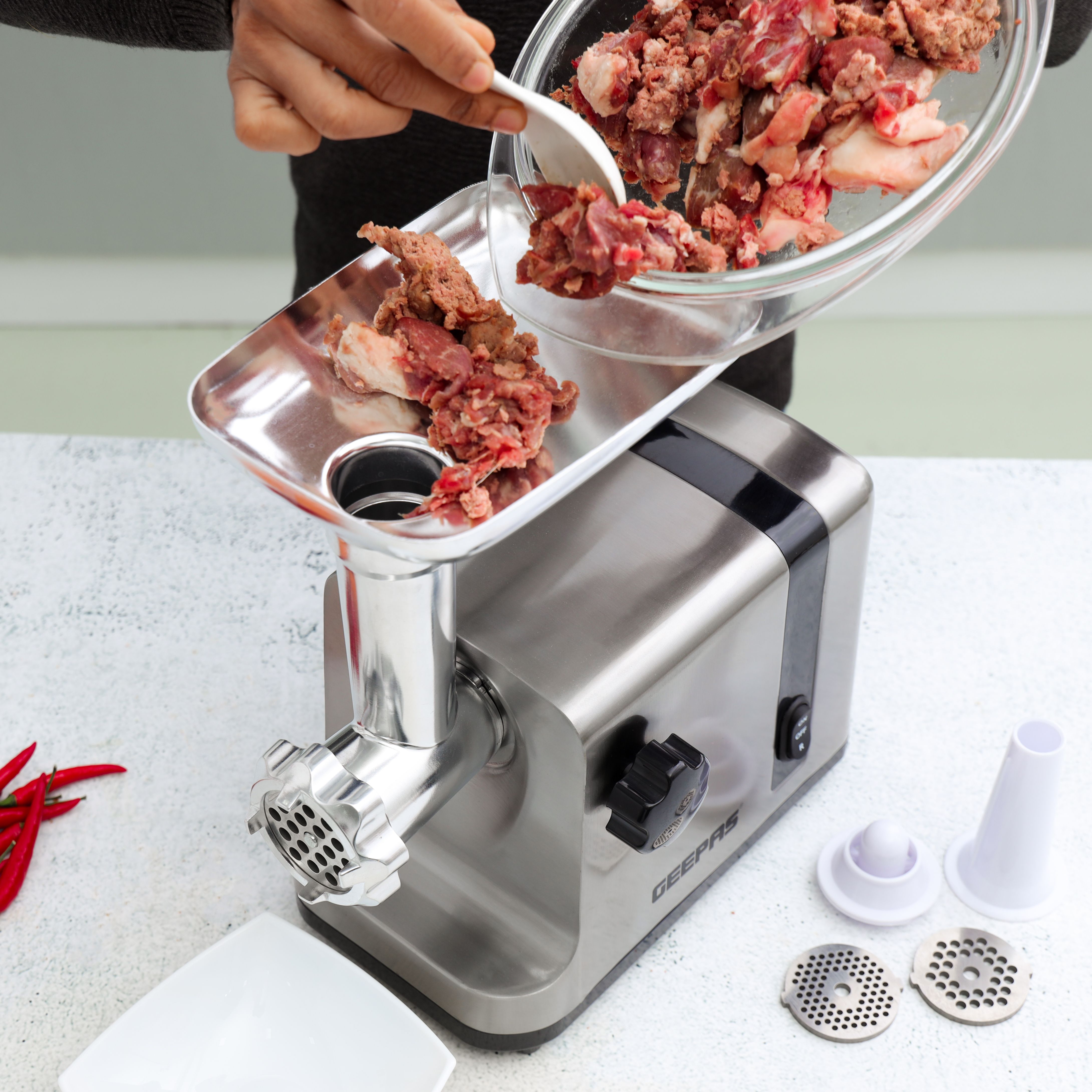 The heavy-duty Geepas Stainless Steel Meat Grinder has a max loaded power of 2500W.